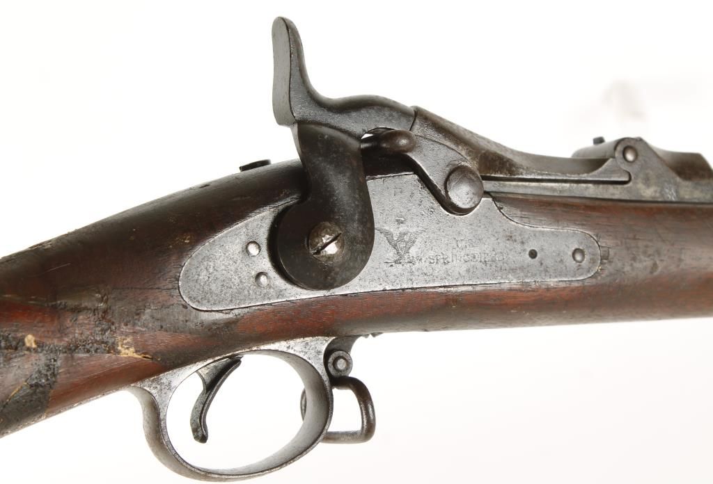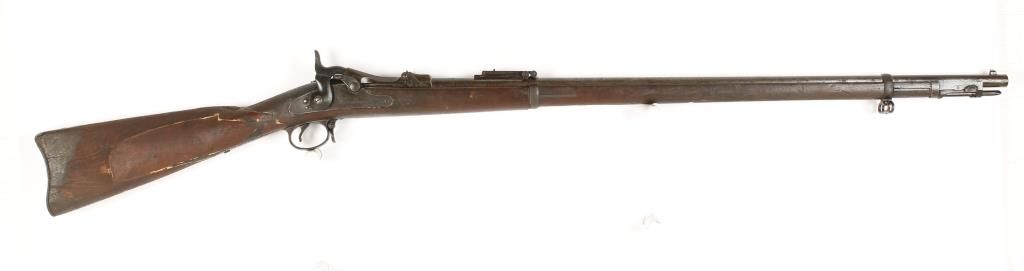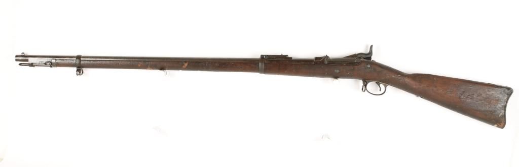 U.S. Military trapdoor rifle with 32" barrel. Full length wood stock which shows numerous repairs to wrist and right side of butt stock. Maintains original sights. Fair markings, with good working action. Missing 1 screw on rear sight. Condition: Fair showing moderate pitting throughout and age. *Antique Firearm*