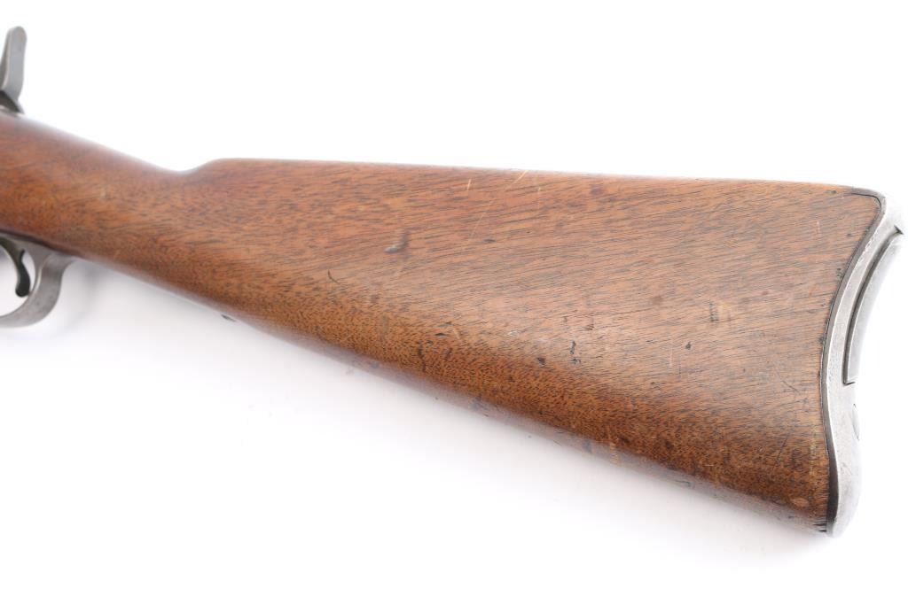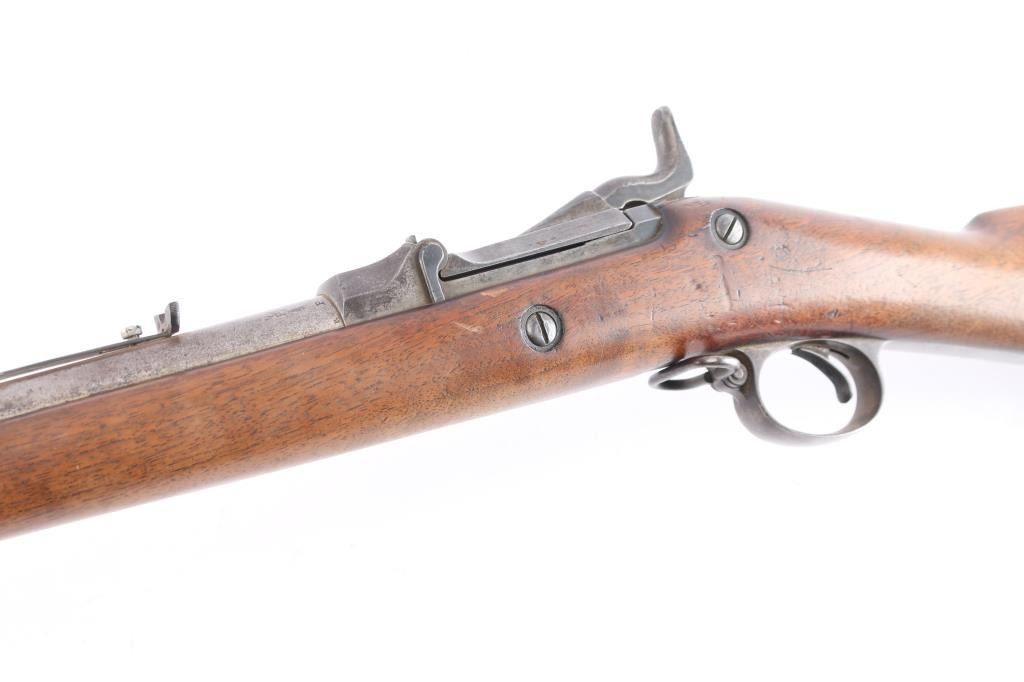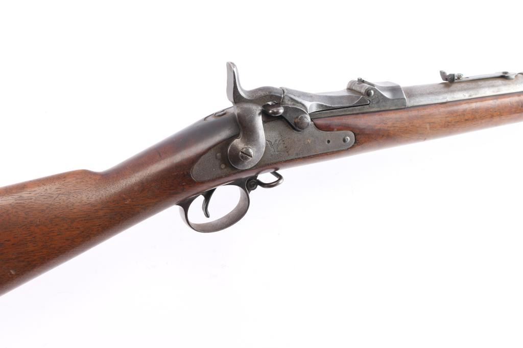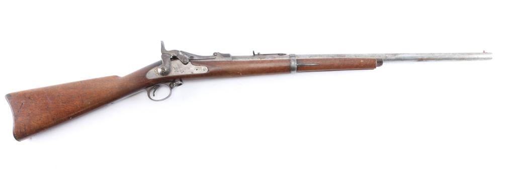 This is a Model 1884, an antique US military single shot trapdoor rifle chambered for .45-70 Government. The barrel has been cut down for sporting purposes, and older parts were used during manufacture of these rifles. Rifle features a 25" round barrel, dovetailed copper tack front sight, non-adjustable buckhorn style rear sight, sling swivel on trigger guard, serrated curved trigger with a checkered tip, checkered hammer spur, external hammer, straight gripped walnut stock with a 'P' cartouche at the wrist, 'SWP' cartouche at the wrist with a faint date, curved steel butt-plate marked "U.S." with a lever style storage compartment door. The barrel is marked over the chamber with "V, P, (eagle head)", and "P". Rifle retains approximately 20% of its original blued finish with general thinning, scratches, dings, edge wear and pitting. Metal displays thin rust throughout, and metal deformation in many of the screw slots. The butt-plate and trigger guard have turned a light brown patina with age. Observed markings are generally sharp edged. The action is smooth and crisp, and the three cock hammer action works well. The bore is frosty with decent rifling. The wood furniture is good with dents, dings, scratches, and normal handling wear.