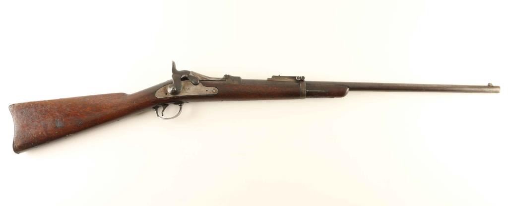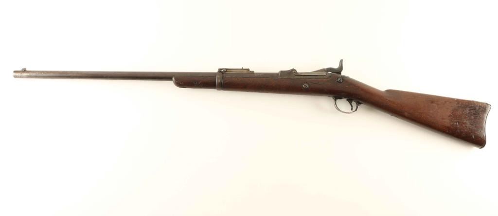 Single- shot trapdoor rifle. This is a Model 1884 Springfield infantry rifle that has been sporterized. Metal appears to have been painted black at one time, with traces remaining in recessed areas. Blued finish has faded to almost white. faint U.S. Springfield w/ eagle present on lock plate. 45-70 etched on left side of barrel. Bore is dark and dirty. 3 cock hammer is tight. trapdoor is a little lose. Stock has numerous dings/scratches, with no markings visible. Stock has been cut down with cleaning rod channel visible. Proper adjustable rear sight present. Good parts gun for the trapdoor collector. NRA condition-Poor plus Antique Firearm.
