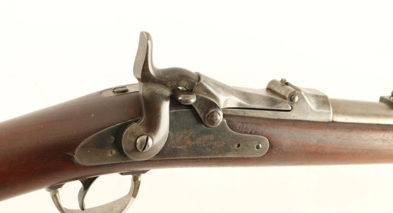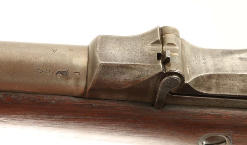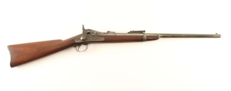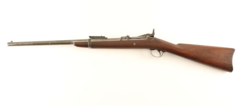 Springfield M 1884 carbine. Barrel length: 22”, manufactured 1892. Overall condition good, 20% original finish remaining, bore shows some pitting. Sights appear to have been replaced, rear sight missing front screw. The Springfield model 1884 was one of the "Trapdoor Springfield" rifles. *Antique Firearm*