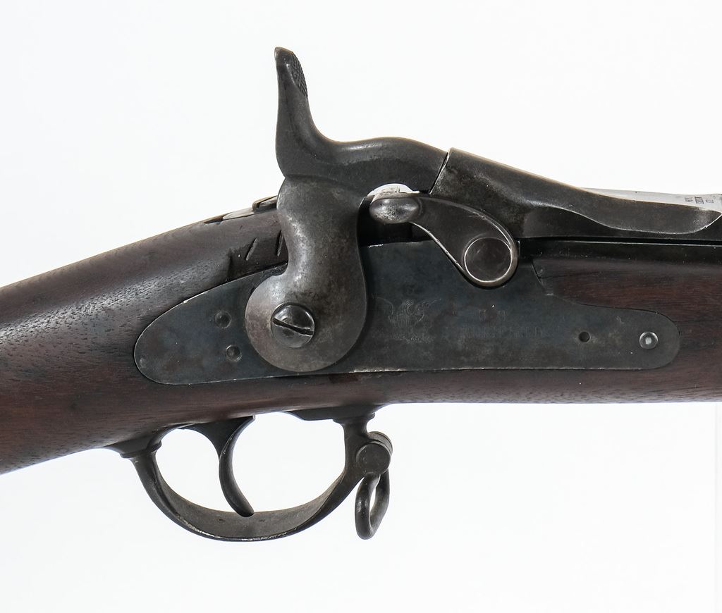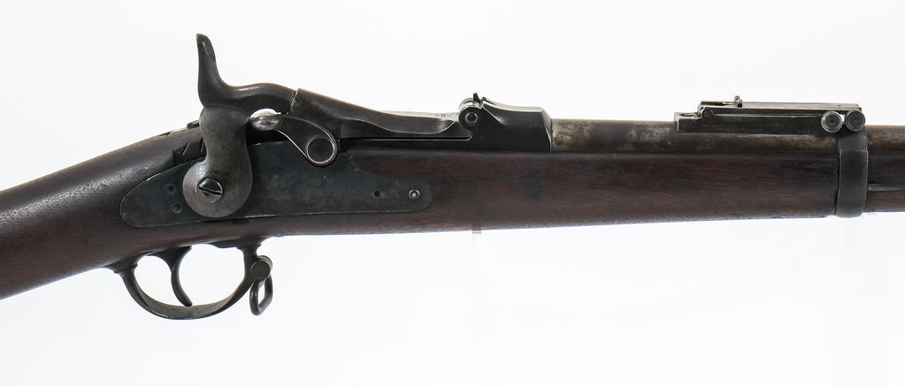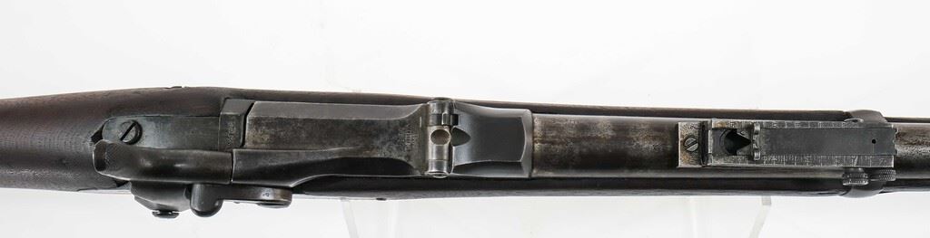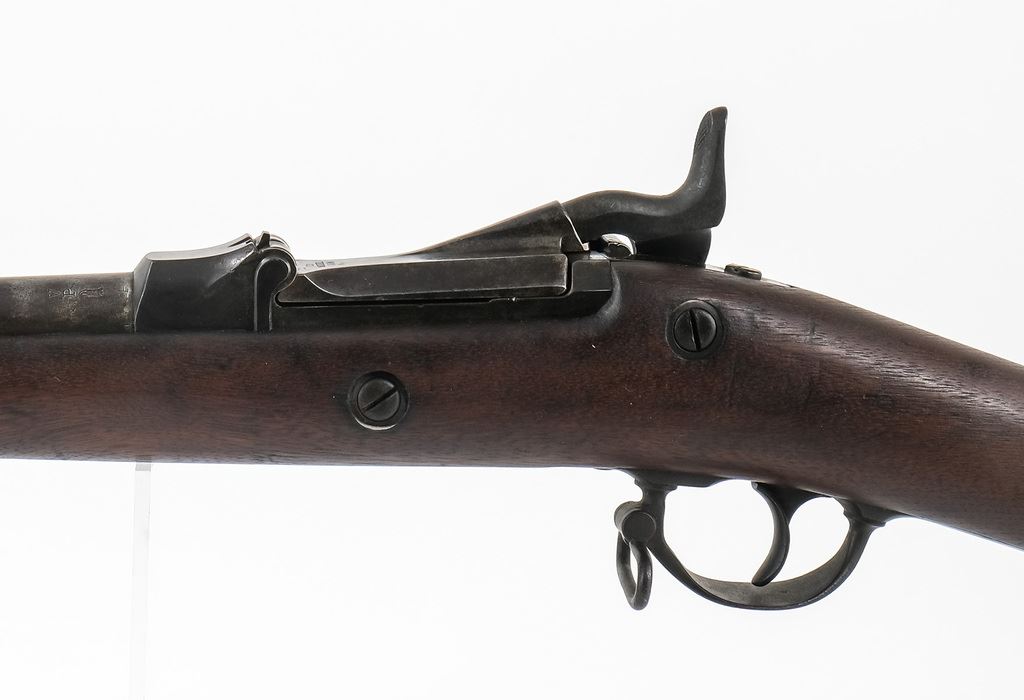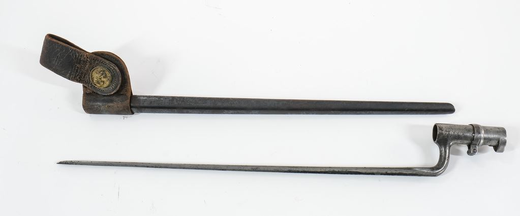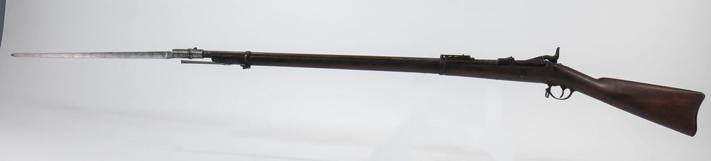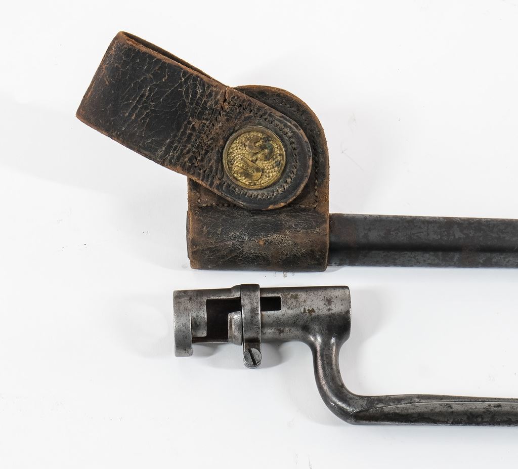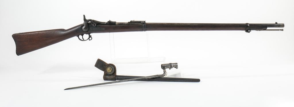 U.S. Springfield Model 1884 trapdoor rifle chambered in .45-70. This is the 32" rifle version with fixed blade front sight and Buffington rear sight and with serial number 431280. The breech block is marked "U.S. MODEL 1884", the butt plate is marked "U.S.", the barrel bands "U" and there is a faint cartouche and circle P remaining on the sanded stock. Included is a period, "U.S." marked bayonet and U.S. marked scabbard. The metal has turned a black and brown patina. The lock plate inscription and eagle are distinct. The stock is in nice condition with very few marks. There are two small surface cracks just forward of the lock plate. The action functions as expected. Antique.