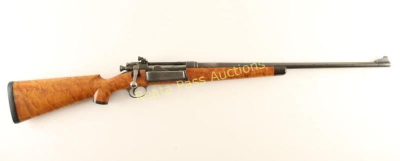 '2nd Type' Sporterized U.S. Military bolt action service rifle chambered in .30-40 Krag, circa 1894. Features a blued finish, 23.5" barrel, raised blade front sight, removed rear sight, unmarked receiver sight, side-mounted hinged magazine, straight bolt handle, manual safety, magazine cut-off, rounded trigger and smooth maple pistol grip shoulder stock with right handed cheek rest, black forend/pistol grip cap & recoil pad. Rifle retains approximately 30% of it's blued refinish showing large scattered losses & pin prick pitting on the barrel with a small amount of visible bluing on the top of the receiver and the balance turned to a dulled grey patina. Action is smooth, bore is bright with good rifling, and custom wood stock is fine. Condition is good+. ***Antique Firearm***