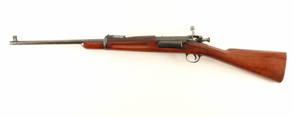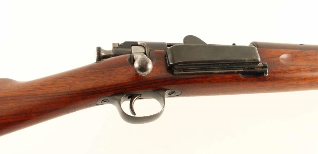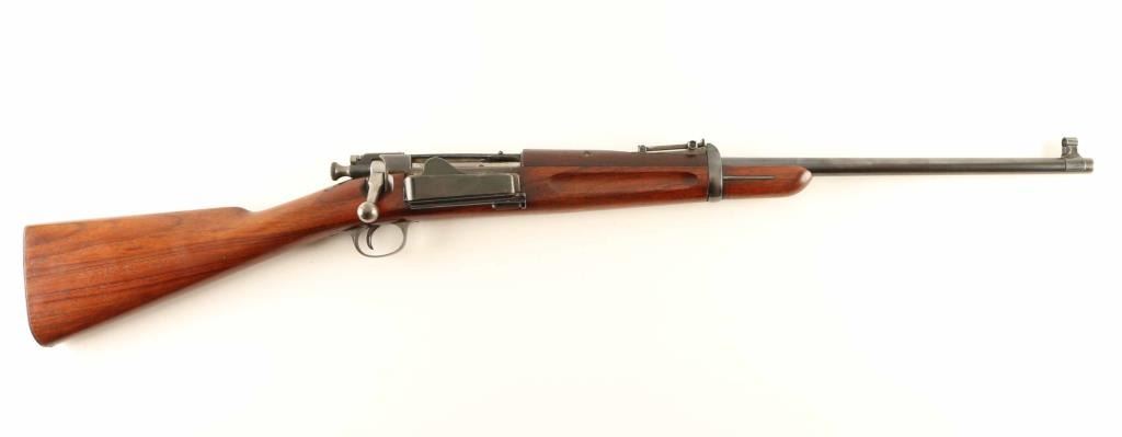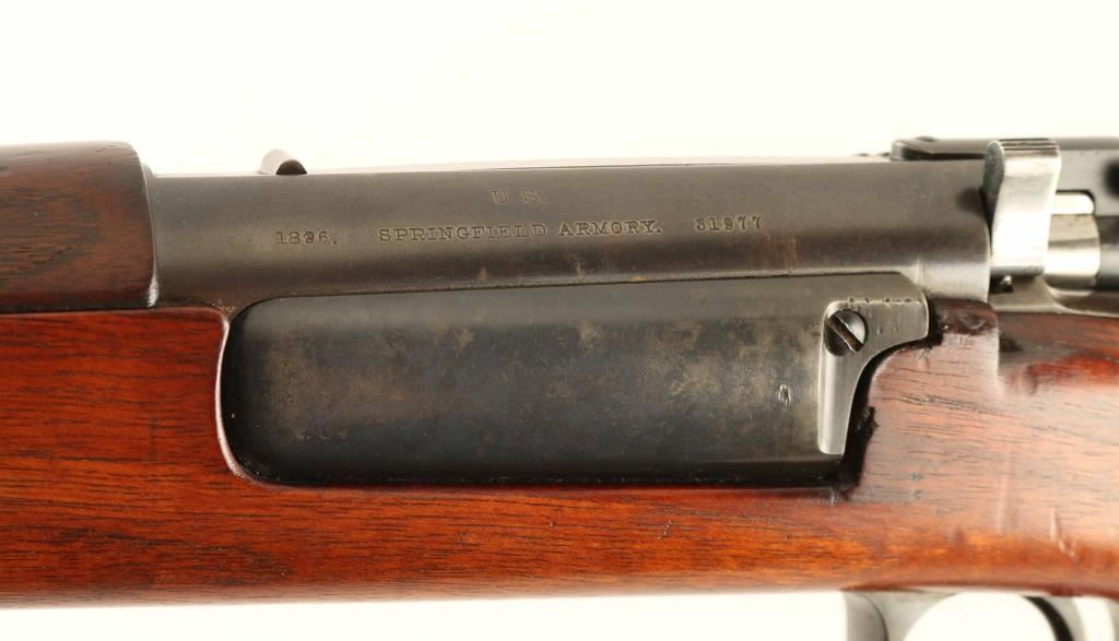 Antique U.S. military bolt action service rifle chambered in .30-40 Krag, manufactured circa 1897. This 1896 rifle is configured as a carbine but lacks the saddle ring & bar found on the left side. Features a blued finish, 22" barrel, blade front sight with installed cover, "C" marked flip-up ladder rear sight graduated to 2,000 yards, single barrel band, side-mounted 5 round hinged magazine with cut-off on the left side of the receiver, polished bolt with two-position safety on the rear, smooth trigger, smooth walnut handguard and straight grip shoulder stock with finger grooves in the forend, rounded bolt handle notch & trapdoor metal buttplate. The underside of the wrist is stamped "A.L" and with a circled script "P". Rifle retains approximately 35% of it's blued finish with the majority of the finish loss on the receiver. Action is smooth, the bore is good, markings are clear and the wood stocks are good with small losses & blemishes. Condition is NRA Good. ***Antique Firearm***