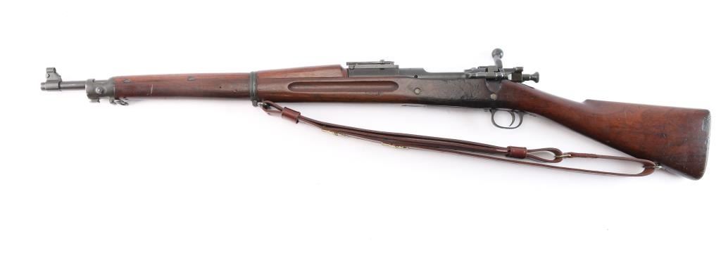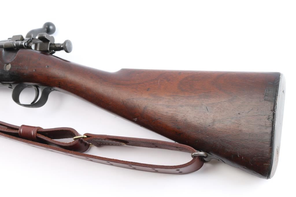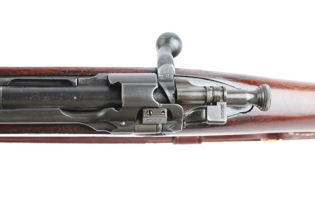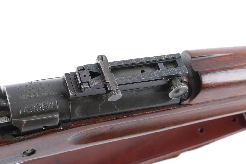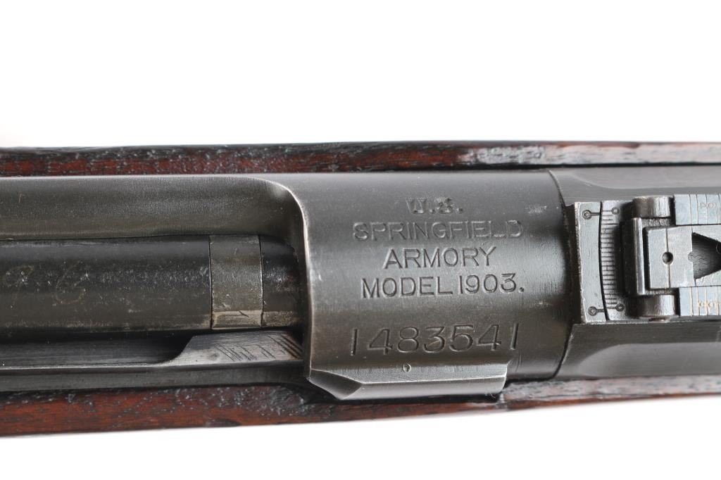 Between Wars bolt action US Military rifle manufactured circa 1934. (Serial Number) S.A. barrel dated 4-36. Production was suspended in 1936 with the introduction of the M1 Garand. The 1903 was the standard U.S. service rifle, 1903-1936 making this barrel somewhat rare. Features 24" barrel, blade front sight with clip-on protector, ladder type rear sight, manual safety, sling swivels, stacking swivel. Bore is very good condition/bright. Blued finish with parkerized bottom metal, receiver was also correctly modified with the "1936 Hatcher" gas escape hole in the left side and the right side. The 'S' stock with grasping grooves has the "SA " over S.P.G. cartouche on the left wrist. Stanley P. Gibbs started to work at Springfield Armory in 1916, where he worked for 35 years, retiring in 1951. His initials show up on SA new production as well as rebuilt rifles when he was advanced to inspector in the 1936 time frame. "P" proof on the underside of wrist, hinged checkered steel buttplate. Blue is about 85% with edge/handling wear, minor scuffs/scratches, wood is overall very good with the usual minor scratches/dings, action is smooth and the bore is very good/bright.