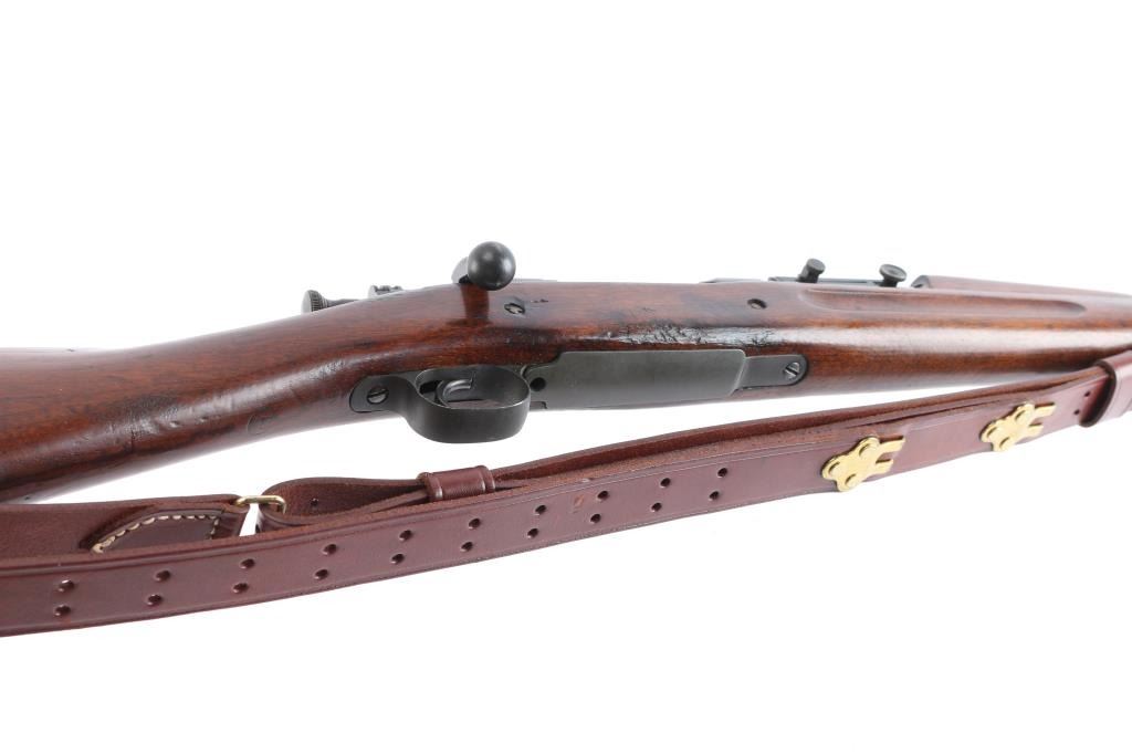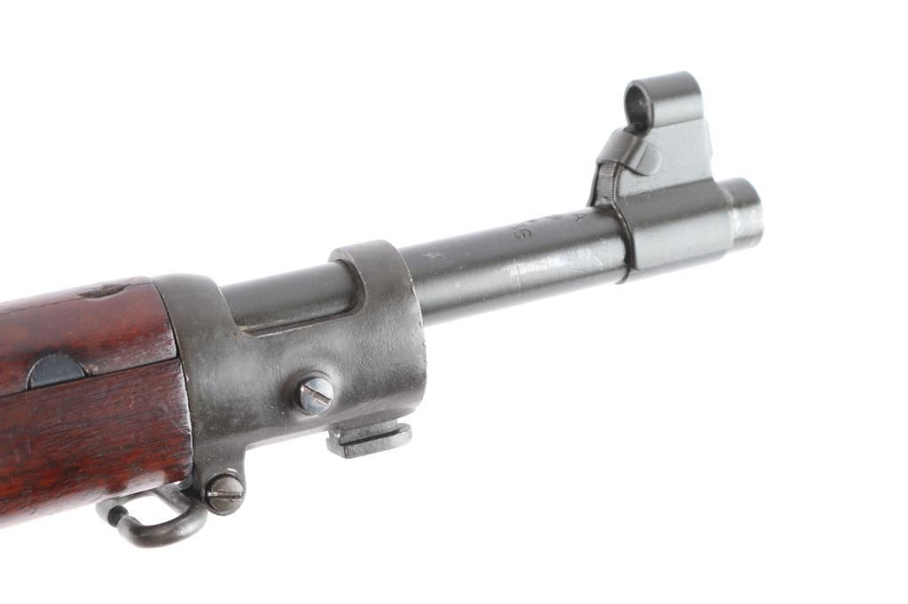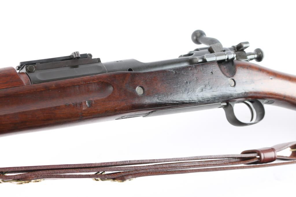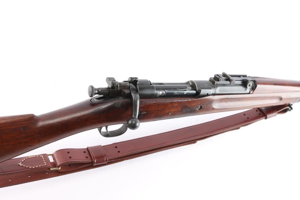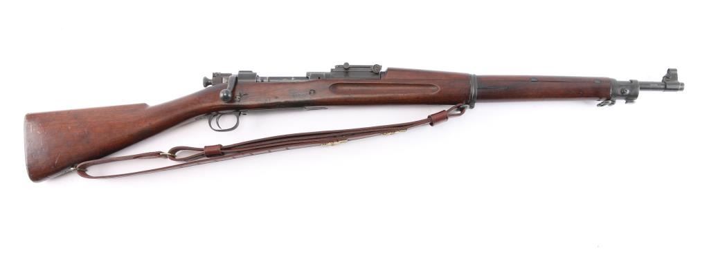 Between Wars bolt action US Military rifle manufactured circa 1934. (Serial Number) S.A. barrel dated 4-36. Production was suspended in 1936 with the introduction of the M1 Garand. The 1903 was the standard U.S. service rifle, 1903-1936 making this barrel somewhat rare. Features 24" barrel, blade front sight with clip-on protector, ladder type rear sight, manual safety, sling swivels, stacking swivel. Bore is very good condition/bright. Blued finish with parkerized bottom metal, receiver was also correctly modified with the "1936 Hatcher" gas escape hole in the left side and the right side. The 'S' stock with grasping grooves has the "SA " over S.P.G. cartouche on the left wrist. Stanley P. Gibbs started to work at Springfield Armory in 1916, where he worked for 35 years, retiring in 1951. His initials show up on SA new production as well as rebuilt rifles when he was advanced to inspector in the 1936 time frame. "P" proof on the underside of wrist, hinged checkered steel buttplate. Blue is about 85% with edge/handling wear, minor scuffs/scratches, wood is overall very good with the usual minor scratches/dings, action is smooth and the bore is very good/bright.