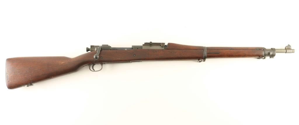 'Scant Stock' Arsenal rebuilt U.S. Military contact bolt action service rifle chambered in .30-06 Springfield, manufactured circa 1920. Features a blued refinish, 24" barrel marked "S(inside a circle)[flaming bomb] 7-44", blade front sight, windage adjustable ladder style rear sight graduated to 2,700 yards, bayonet lug, two barrel bands, cut-out in the receiver to accept the Pedersen device, internal 5 round box magazine with cut-off on the left side of the receiver, smooth trigger, turned-down bolt handle, three-position safety on the rear of the bolt, sling swivels, smooth full-length walnut handguard, and semi-pistol grip shoulder stock with trapdoor metal buttplate, "P," "AAP" & an illegible rectangle cartouche. Rifle retains approximately 85% of it's arsenal refinish with the majority on the receiver in the form of thinning. Action is sound, the bore is excellent, and the wood stocks are very good+ with scattered blemishes. Condition is NRA Very Good. ***C&R Firearm***