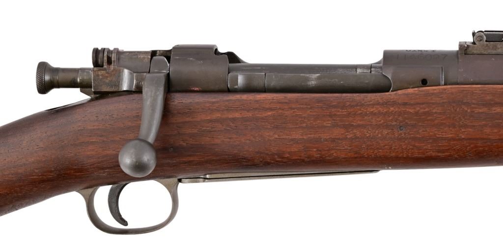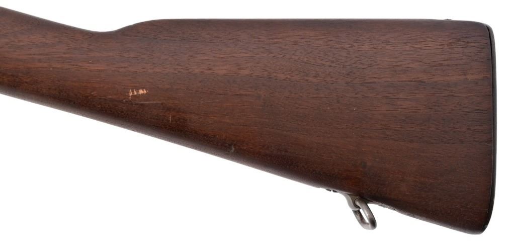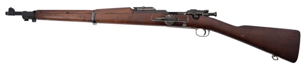 S/N 1146027. Very good condition rifle with Pederson Device cut-out on receiver, over M15 Grenade Launcher Sights. SA, flaming bomb, 3-33 on 24" barrel. Missing barrel band bolts. Modern.