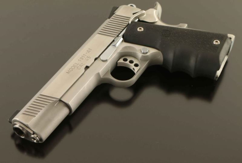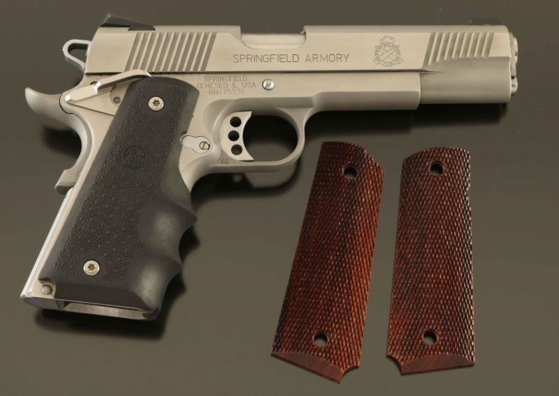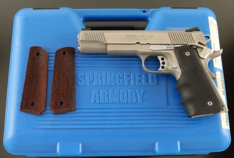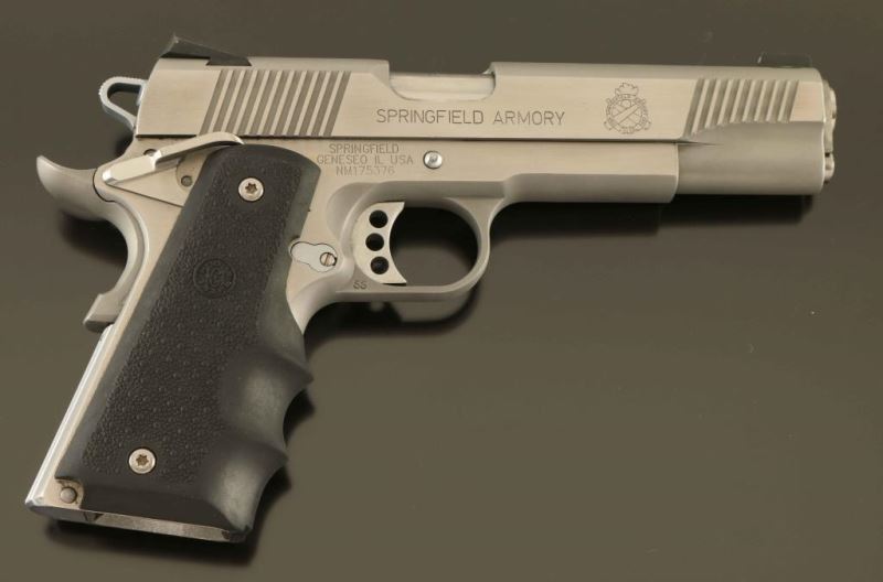 Stainless steel 1911A1 pattern single action semi-automatic pistol chambered in .45 Auto. Features a brushed/matte finish, 5" stainless steel match grade barrel with loaded chamber viewing window, two-piece N.M. full length guide rod, dovetailed low-profile three-dot night sights, front & rear cocking serrations on the slide, serrated adjustable trigger, skeletonized hammer with serrated spur, ambidextrous manual safety on the frame, extended beavertail grip safety, push button magazine release, no magazine, serrated flat mainspring housing with internal locking safety, beveled magazine well and one-piece pebbled black rubber Hogue wrap-around finger groove grip. Includes a factory hard case with manual, flag, tools, keys, a pair of checkered Cocobolo grips and the OEM Novak's low-profile sights. Pistol exhibits light handling marks and bright rubs/scratches near the take-down pin with no major wear observed. Action is very smooth, the bore is excellent and the rubber grips are fine. Condition is near NRA Excellent in case. ***Modern Firearm***