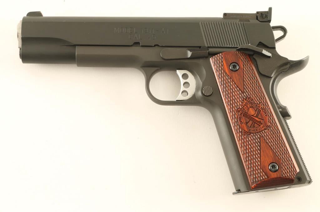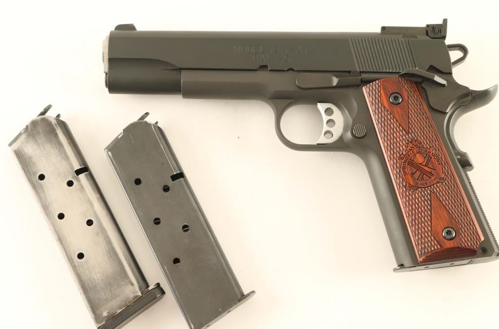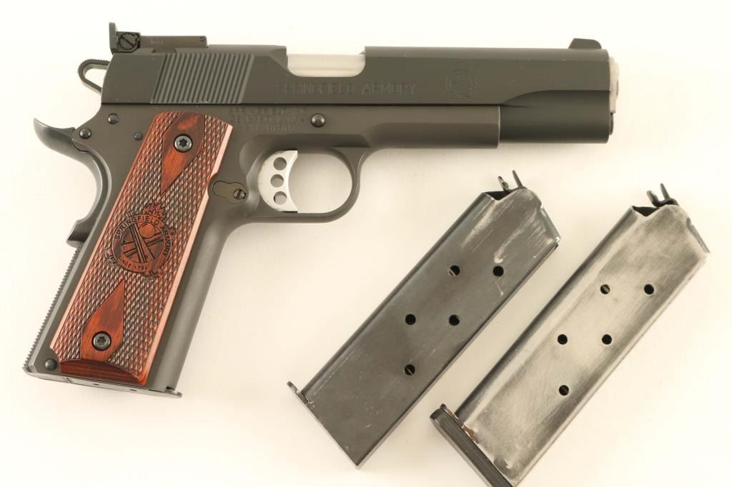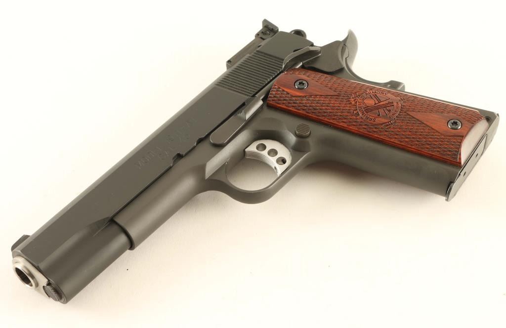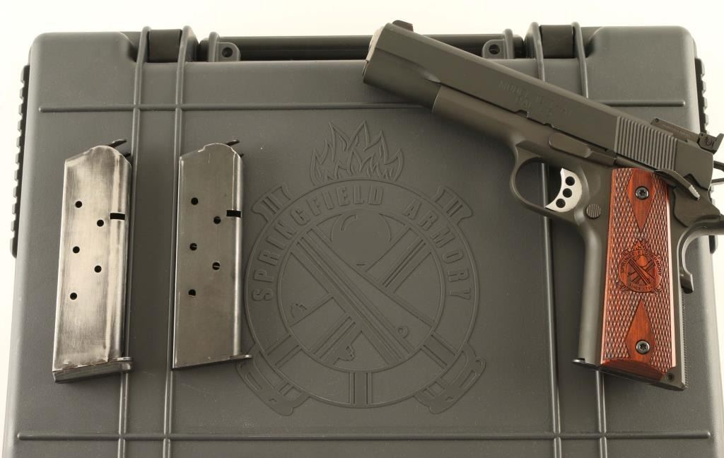 'Range Officer' American made single action semi-automatic 1911A1 pattern pistol chambered in .45 Auto. Features a parkerized finish, 5" stainless steel match grade barrel with loaded chamber viewing window, match grade stainless steel barrel bushing, dovetailed serrated black steel front sight with red painted accent, fully-adjustable serrated rear sight, serrated aluminum trigger adjustable for overtravel, skeletonized hammer with serrated spur, extended thumb safety on the left side of the frame, upswept grip safety with memory bump, push button magazine release, blued 7 round magazine, knurled flat mainspring housing with internal locking safety, steel frame with beveled magazine well and two-piece double diamond checkered cocobolo grips with Cross Cannon insignias. Includes the original factory hard case with documents, paddle holster, tools, keys and two spare magazines. Pistol retains approximately 98% of its original finish showing slide wear on the barrel, light holster wear and some handling marks. Action is very smooth, the bore is bright with sharp rifling & a bulge 3” from the muzzle and the wood grips are very good with dulled points. Condition is NRA Good in case. ***Modern Firearm***