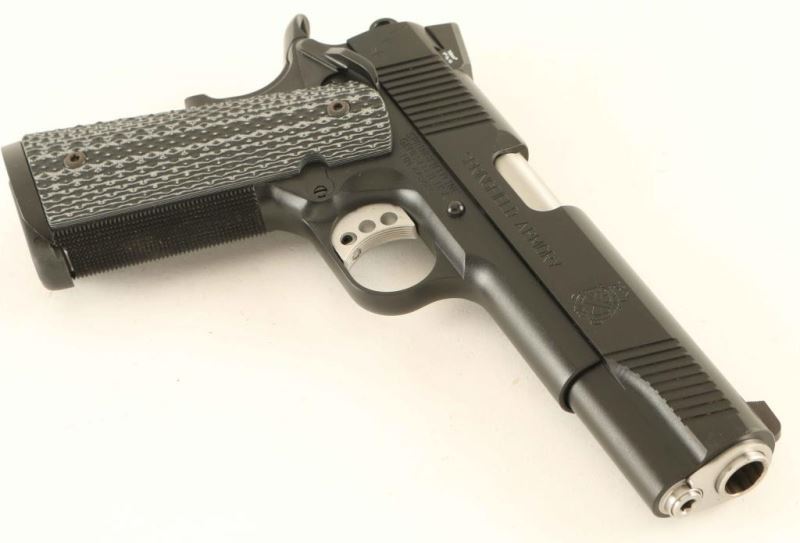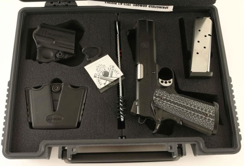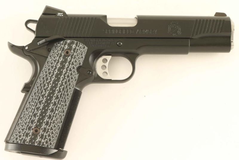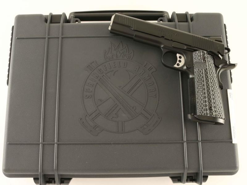 'Tactical' Premium quality 1911A1 pattern single action semi-automatic pistol chambered in .45 Auto. Features a black Armory Kote finish, 5" stainless steel match grade barrel with loaded chamber viewing window, two-piece N.M. full length guide rod, dovetailed low-profile three-dot night sights, front & rear cocking serrations on the slide, serrated adjustable trigger, skeletonized hammer with serrated spur, ambidextrous manual safety on the frame, extended beavertail grip safety, push button magazine release, 7 round magazine with slam pad floorplate, knurled front strap, knurled flat mainspring housing with beveled magazine well and two-piece textured grey/black G10 grips. Includes the original factory hard case with documents, brush, flag, paddle holster, belt loop double magazine carrier and spare magazine. Pistol exhibits approximately 99%+ of it's original finish showing slide wear on the barrel with no other other observed wear. Action is very smooth, the bore is excellent and the G10 grips are fine. Condition is near NRA Perfect in case. ***Modern Firearm***
