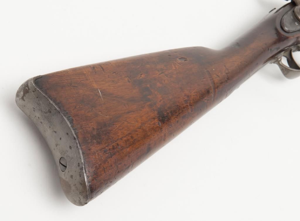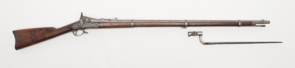 Springfield 2nd Model, Allin Conversion rifle, cal. 50/70, Serial #NSNV. The rifle is overall fair condition with 38” blued barrel, a rear sight missing its ladder and socket bayonet. The barrel has gone to a light gray patina with slight surface erosion. The action is patina also with the date of 1864. The smooth wood stocks show significant wear including mars, compressions and scrapes consistent with military use, ending in a smooth, crescent metal butt plate. The bore isgood and the markings are sharp. However, the hammer will not remain cocked. (Antique). Est.: $1,000-$2,000.