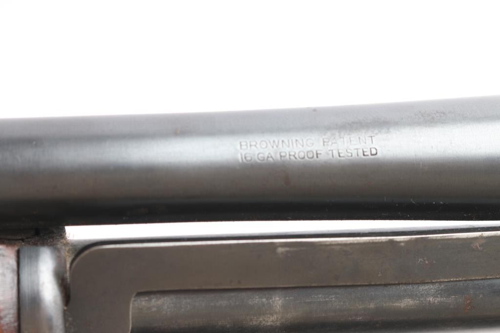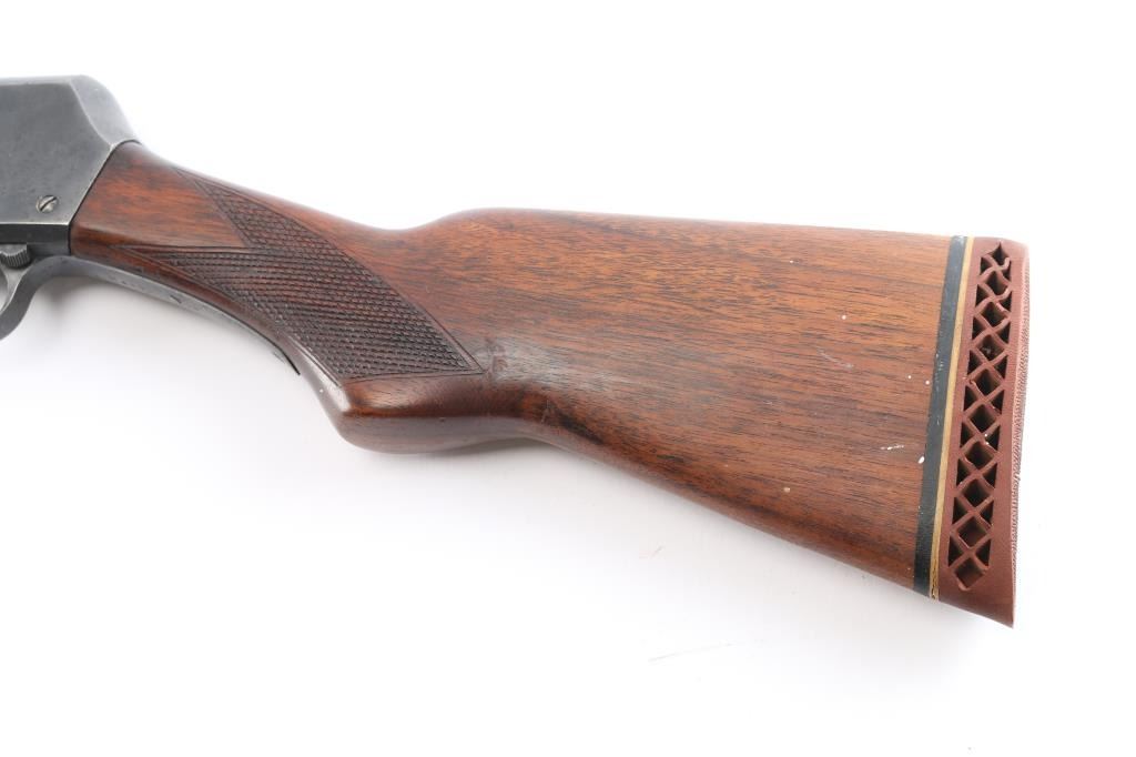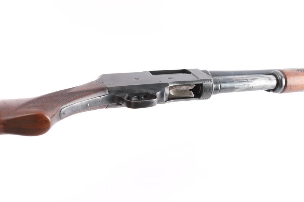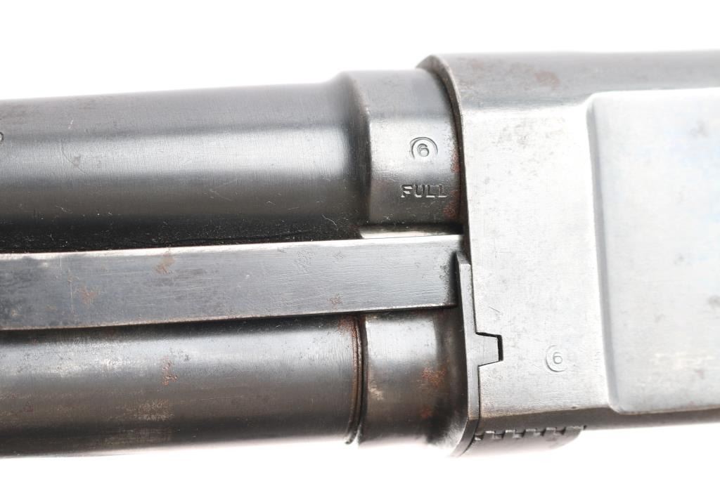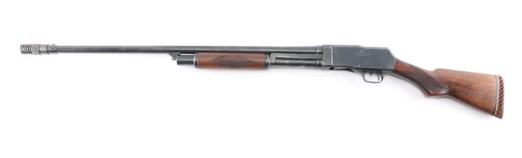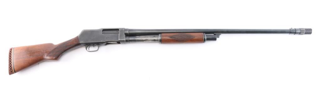 Pump-action 16 Gauge shotgun, circa 1947-68. Features a 28" take down barrel with white front bead sight and an adjustable Poly-choke. Suicide safety in trigger guard, located in front of the trigger. Wood pistol grip buttstock and forend, both with checkered panels at the wrist and sides of forend, vented Wisler Wester Targets butt pad. Bore has rust spots in chamber. Some scratches and Retains approx. 70% finish. Scattered surface rust and wear. Proof tested barrel mfg 1947-68 NRA condition is fair. ***C&R Firearm***.
