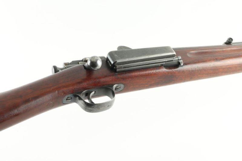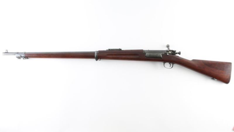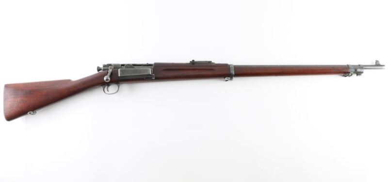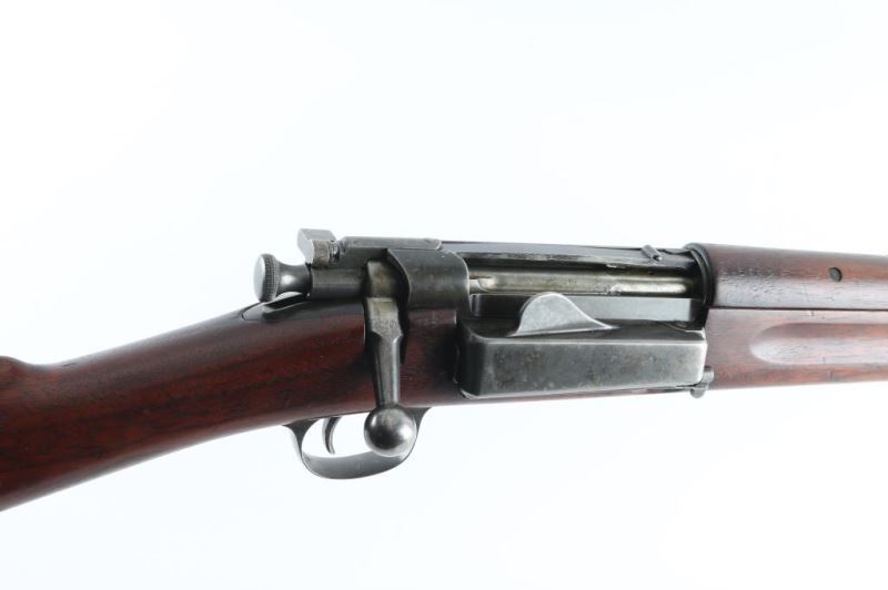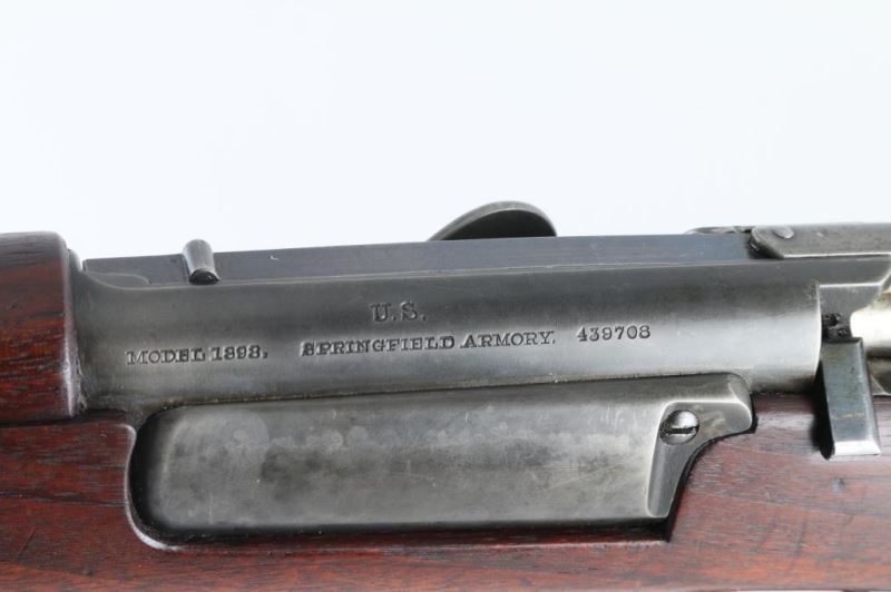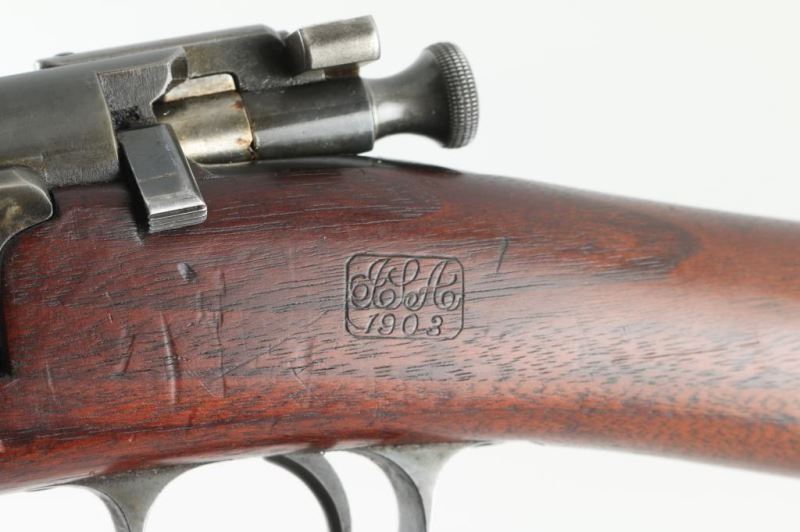 US Military bolt action rifle manufactured circa 1903. Features 30" barrel, blade front sight, tangent rear sight, sling swivels, stacking swivel, manual safety, magazine cut-off, storage trap in butt. Bore is good to very good condition, bright with some frosting. Retains 90% coverage of a medium gray colored finish, some mottling with darker or lighter colors. Extractor retains much bright blue color with light patina on front half. Straw color on bolt body and underside of magazine cutoff. Stock and handguard are very good condition, semi-gloss smooth rubbed finish, matching colors, with deep even cartouche on left of wrist "JSA 1903", circled "P" under wrist. Slight rounding of finger groove edges. Condition is NRA Very Good (refinished stock) *** C&R Firearm *** [From the Jim Sigmon Collection]