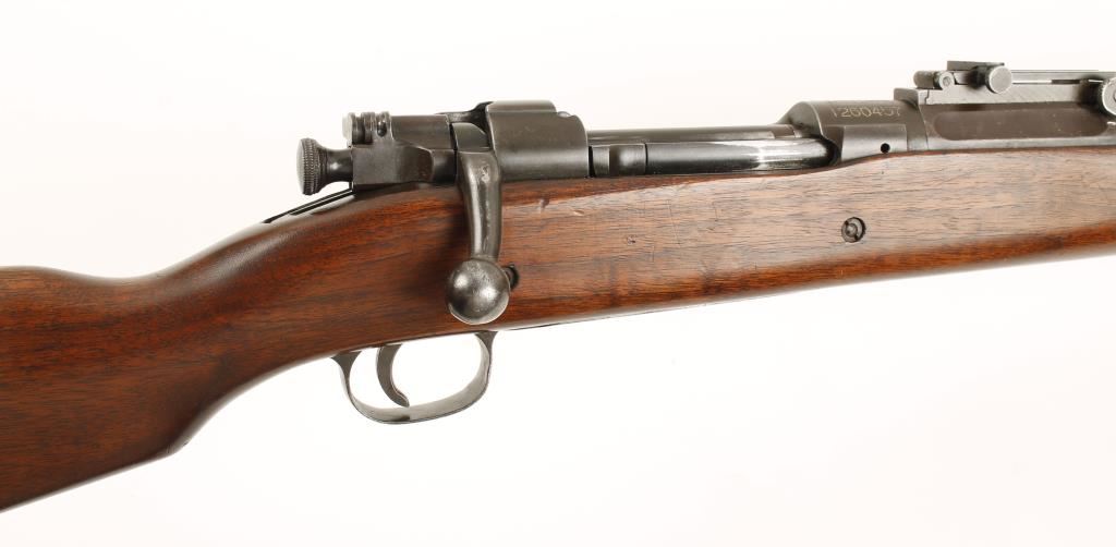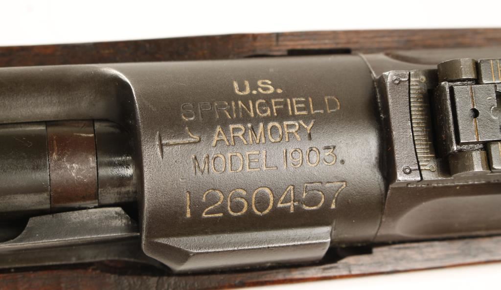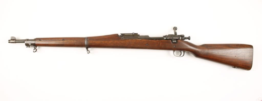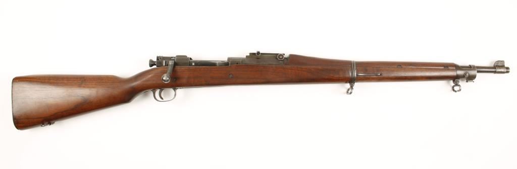 U.S. Military parkerized bolt-action rifle produced in 1923 by Springfield Armory. Features a 24" barrel marked S A 10 -23, a 2,700 yard graduated rear sight, 5 round integral box magazine, bent bolt handle, smooth trigger, stippled buttplate with trapdoor and full length walnut straight grip stock & handguard. Condition is very good as arsenal refinished and missing front sight blade.