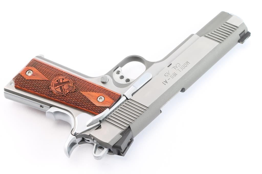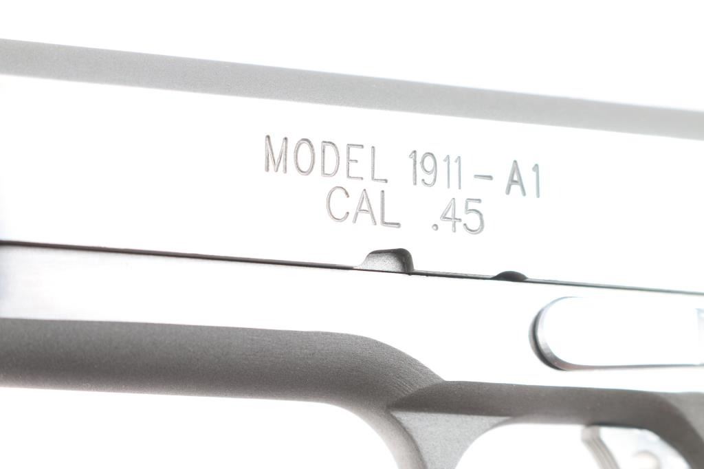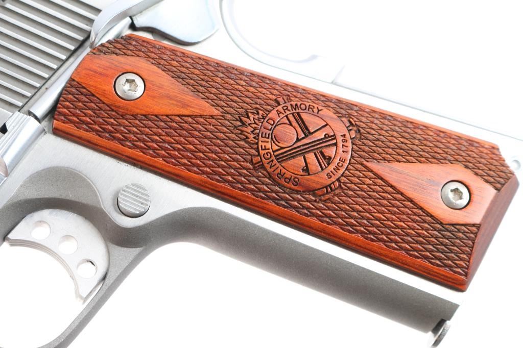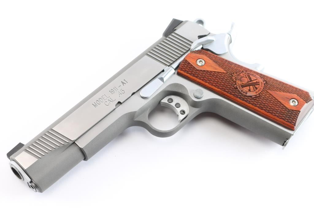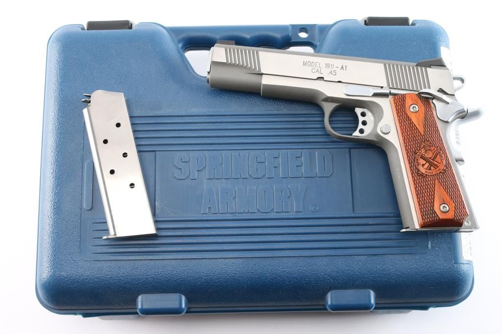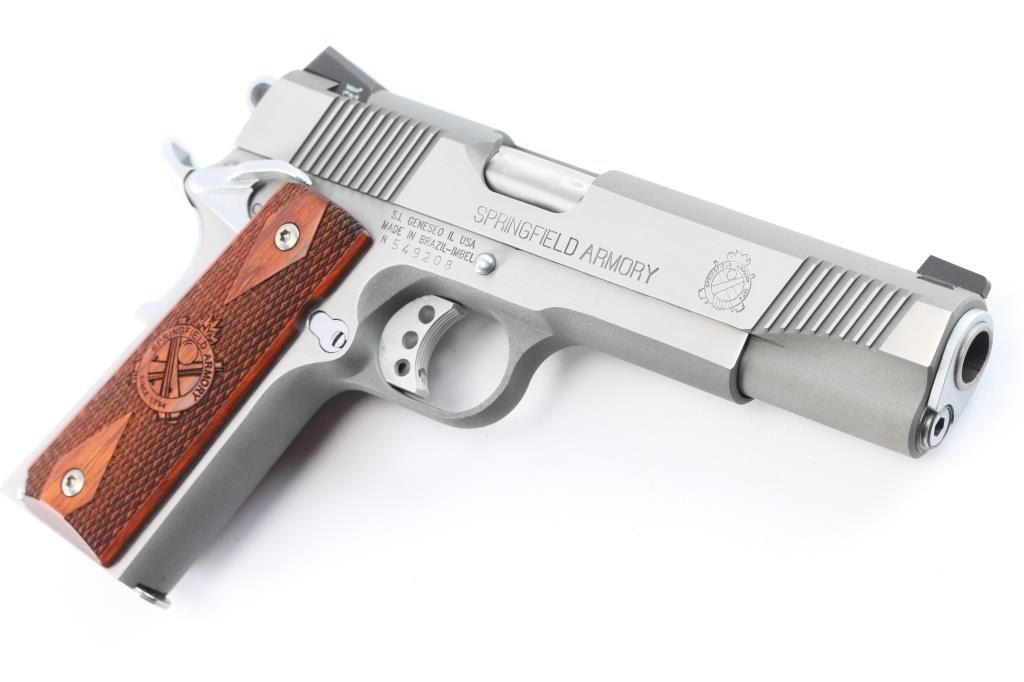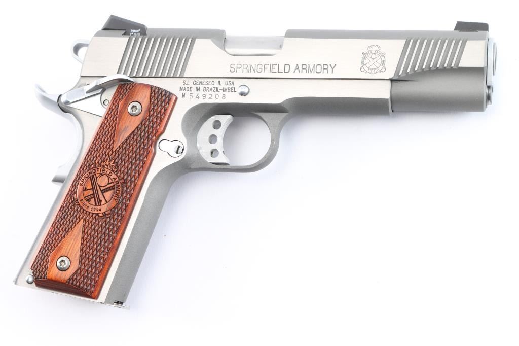 SN: N549208. Manufactured in Brazil by Imbel. ( The frames and slides made by IMBEL are quality forged - not cast). All stainless steel Mil-Spec 1911 style single action semi-automatic pistol. 7+1 capacity. Matte stainless finish with polished sides. Features 5" barrel, cocking serrations fore & aft on sides of slide, dovetailed Trijicon three-dot sights, serrated trigger with overtravel adjustment, serrated hammer spur, extended ambidextrous thumb safety, upswept grip safety with memory hump, push button magazine release, serrated flat mainspring housing and two-piece double diamond checkered walnut grips with Springfield Armory logos. Pistol exhibits little to no visible wear. Action is strong, bore is excellent and wood grips are fine. Includes the original factory hard case with cleaning brush, documents, black polymer holster, two mag holder, (2) magazines.