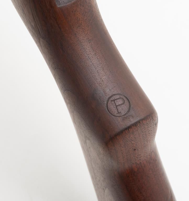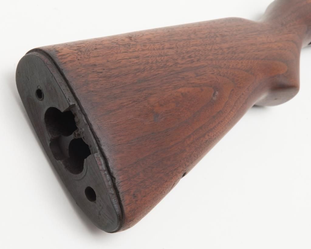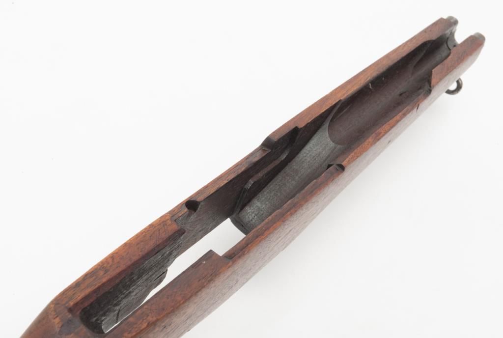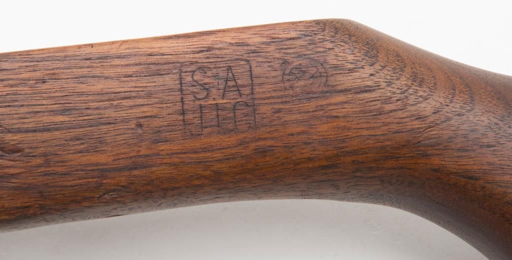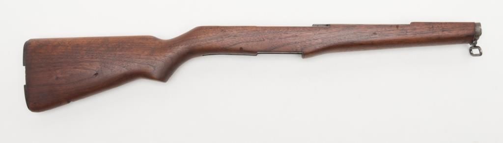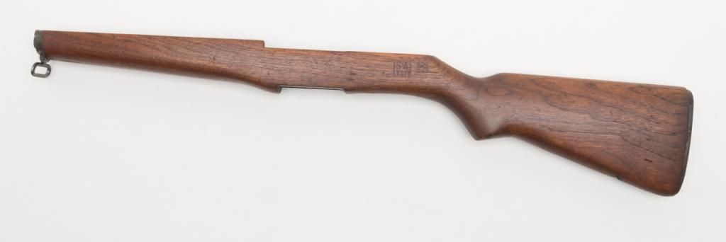 Springfield Armory Garand stock with front sling swivel, overall very good condition with circle P proof, SA/JLG in square cartouche and crossed cannons cartouche above trigger well; ā1 Jā stamped at top of butt face. Est.: $200-$400.