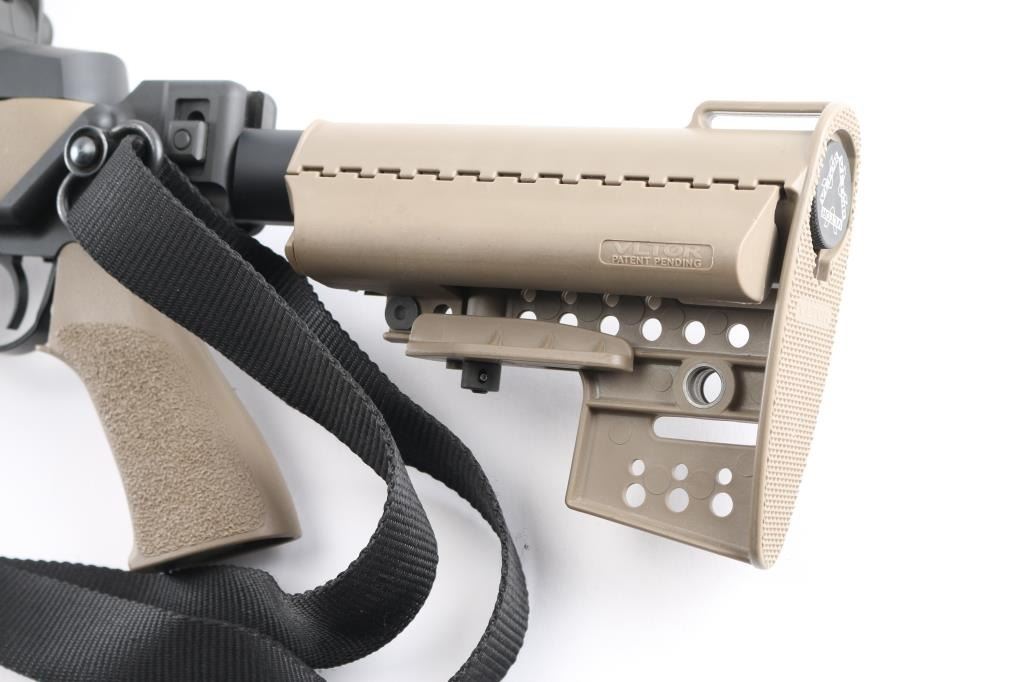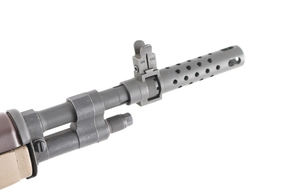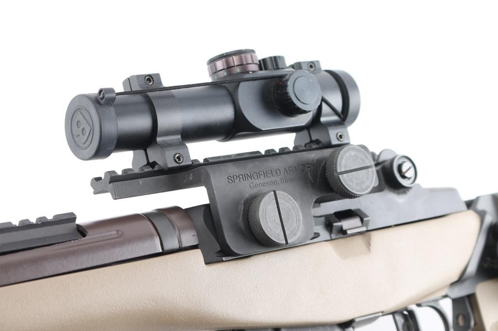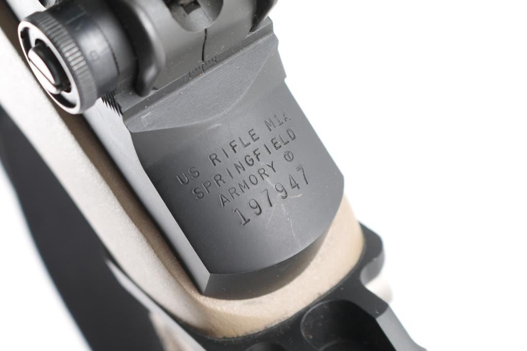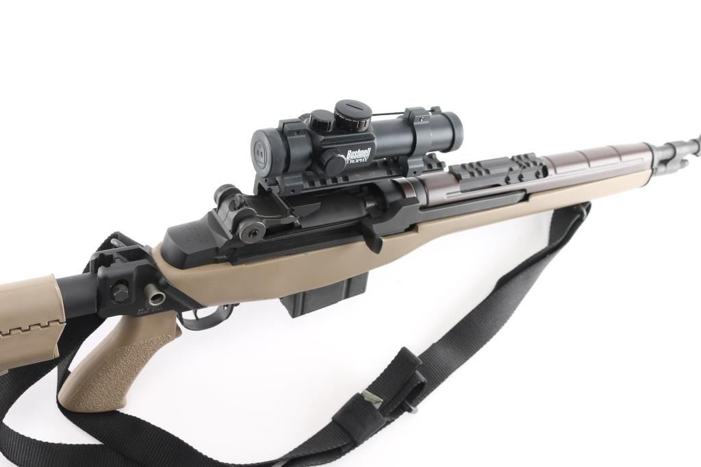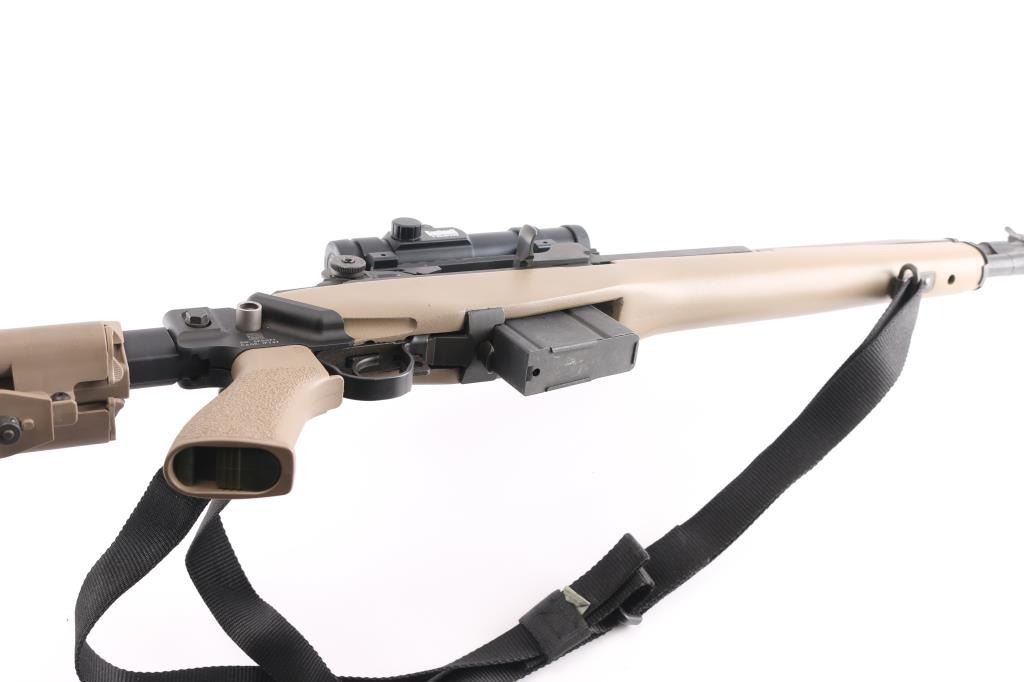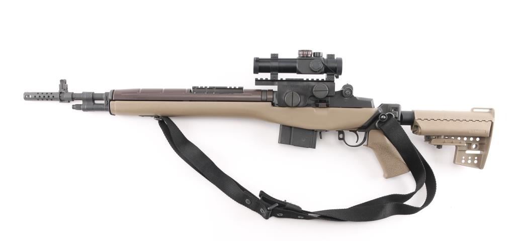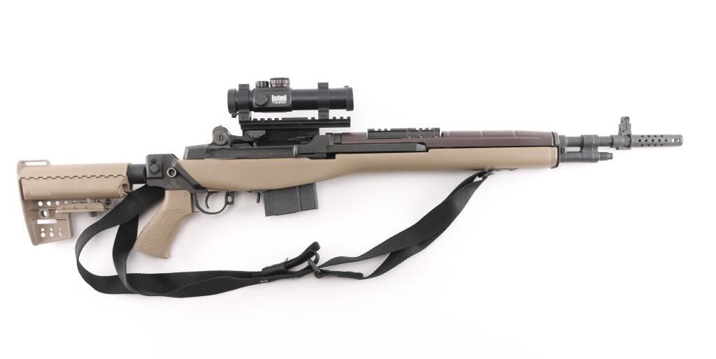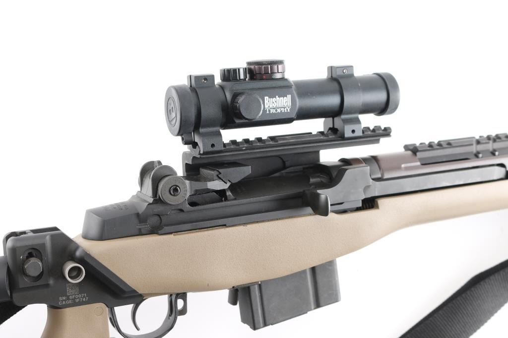 'Scout' semi-automatic rifle based on the US military M14, chambered in 308 Winchester. Features a parkerized finish, 18" barrel, proprietary muzzle break without bayonet lug, shrouded NM .069 blade front sight, adjustable rear aperture sight, smooth two-stage trigger, manual safety, detachable 10 round magazine, FDE-colored synthetic handguard. FDE VLTOR stock with stippled AR style pistol grip, adjustable shoulder stock with dual battery compartments and QD cups. Bore is in very good condition with strong rifling, slightly dirty. Rifle retains approx 95% of its original finish showing very little slide wear on the receiver & bolt. Stock is in very good condition. Comes with one 10 rd magazine and black web sling with quick release swivel, Bushnell Trophy red dot mounted on a Springfield Armory scope mount.