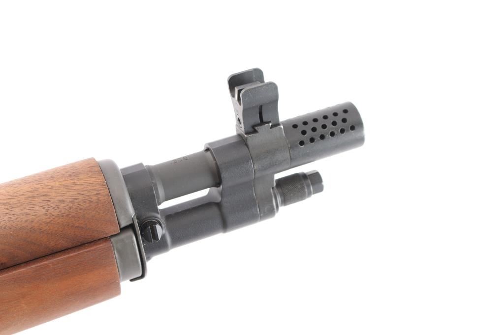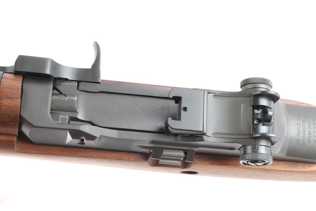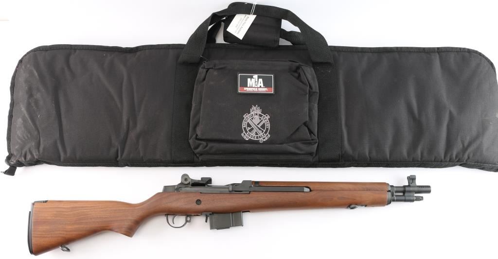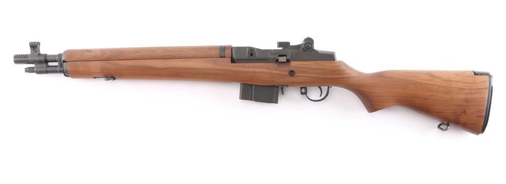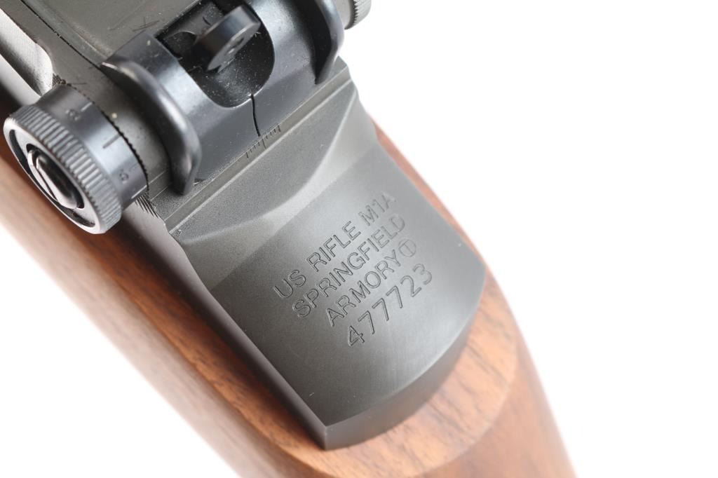 ‘Scout Squad’ Semi-automatic scout variant of the gas operated M14 battle rifle chambered in .308 Winchester, manufactured in Geneseo, IL. Features a parkerized finish, 18" barrel, ported muzzle break , shrouded .062 NM blade front sight, adjustable rear aperture sight, smooth NM tuned two-stage trigger, manual safety, 10 round magazine, stripper clip guide, oversized walnut semi-pistol grip shoulder stock and handguard with sling swivels & flip-up buttplate w/ trapdoor compartment. Rifle retains approximately 99% of its original finish showing very little wear. Action is smooth, the bore is excellent and the wood stock is excellent. Comes with a Springfield Armory soft carry case with owners manual/paperwork.