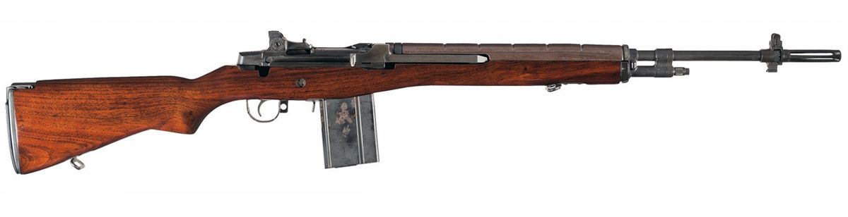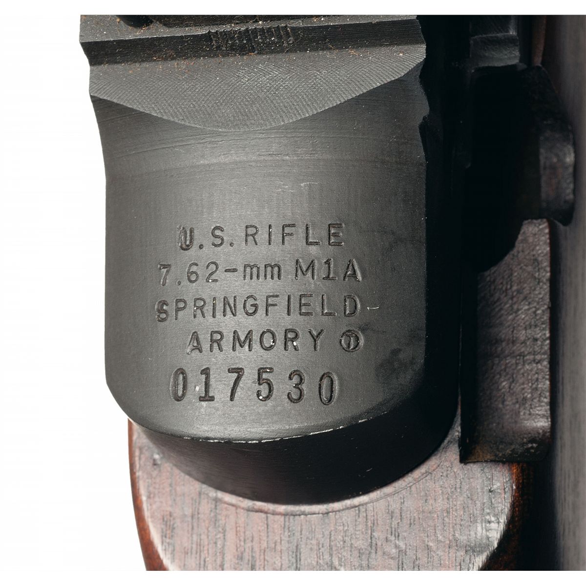 Flash suppressor, military front and rear battle sights. The bolt is marked "7790186/TRW ZG" The rear of the receiver is marked "U.S. RIFLE/7.62-mm M1A/SPRINGFIELD/ARMORY circled T/017530". Fitted with a one piece walnut pistol grip stock with a folding checkered buttplate and a brown fiber glass hand guard. Complete with one GI, 20 round magazine.