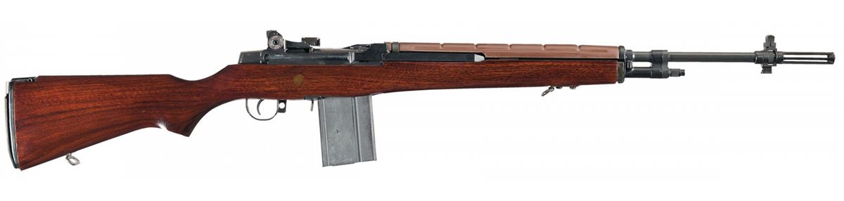 This rifle has a fixed front and fully adjustable rear peep sight with the windage drum marked "NM ENREX" and the elevation drum marked "WC E". The standard GI barrel is marked "TRW" with the date "3 64" and has been fitted with a long flash hider/bayonet lug. Bedded in a smooth walnut civilian stock with a brown, fiberglass handguard, sling swivels and a flip up checkered steel buttplate. Complete with two magazines and a set of plastic front and rear sight covers.