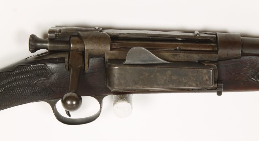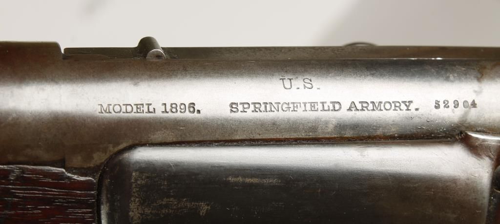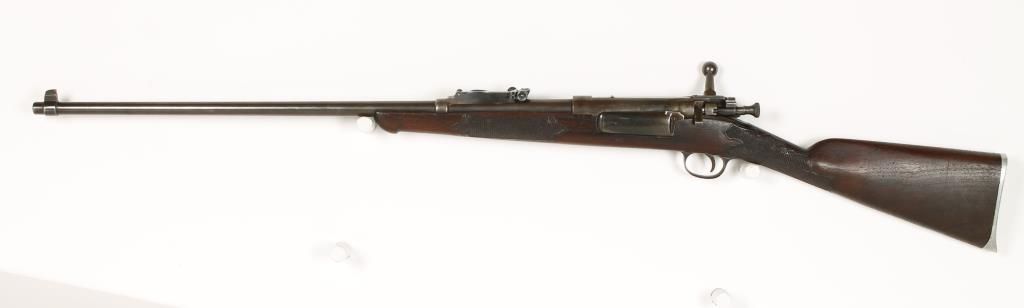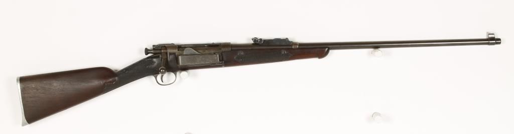 SN: 52904, Early U.S. military bolt action Krag rifle sporterized with barrel being cut down to 26". Stock has been replaced with straight grip checkered stock with ornate aluminum butt plate. maintains graduated rear sight and front sight is banded over barrel. Good bore and action. Condition: Fair to good showing 30% original blue which has turned to brown patina. Wood is good. *Curio & Relic Firearm*