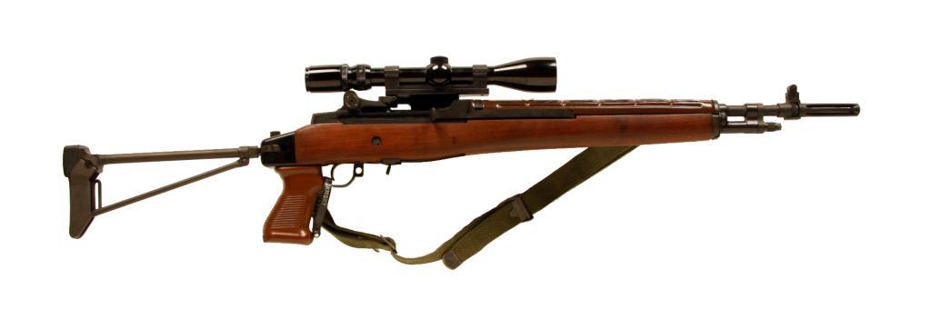 Springfield Armory Mdl M1A Cal 7.62mm SN:033734, Semi auto military rifle with paratrooper style folding stock and pistol grip. Blued finish, wood stock with composite pistol grip and stamped plastic hand guard, 18" barrel with flash hider, good bore and action. Condition: Very good to excellent. Mounted with Bushnell 3x-9x scope and green canvas sling. Includes gun bag and 2 magazines.