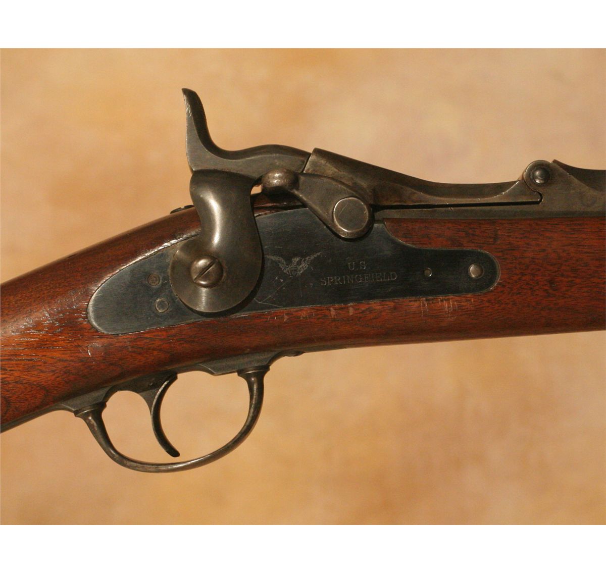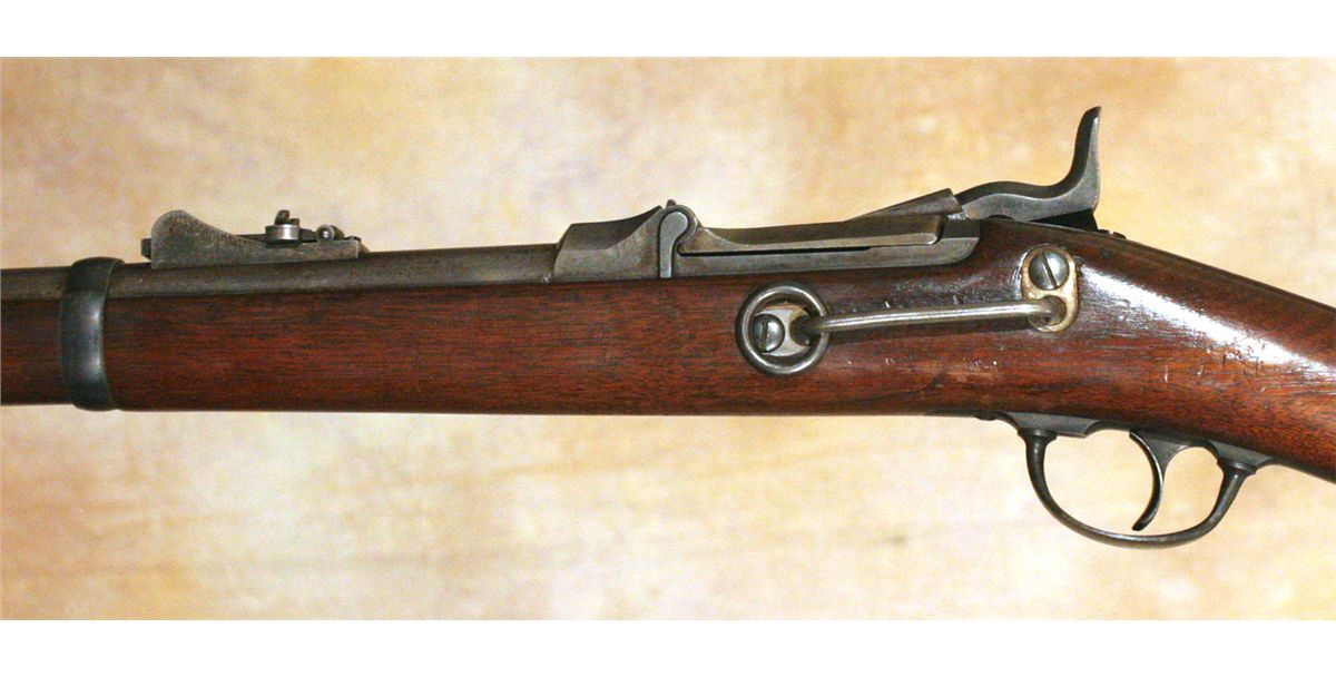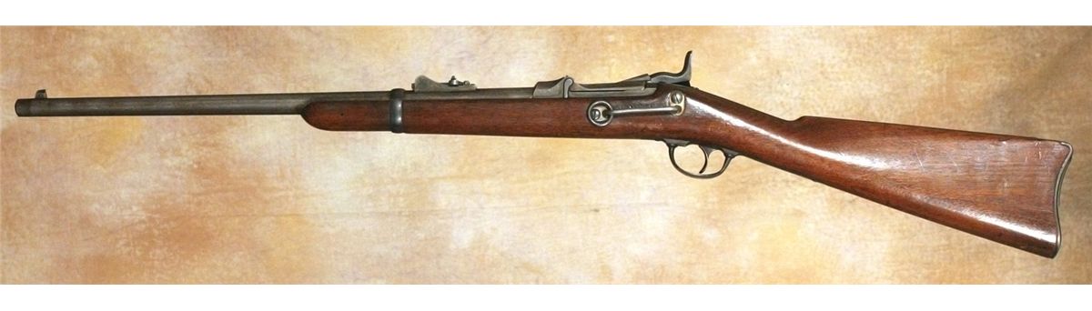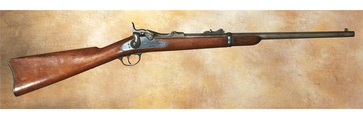 Springfield Armory Model 1879 Military Carbine. 25" barrel. 45-55 calibre. Standard issue weapon for U.S. Cavalry stock. Probably a field replacement during period of use. Together with original cleaning rod in butt stock. Serial #169407. Manufactured between 1879 and 1884.