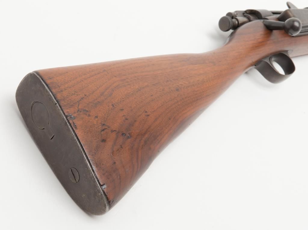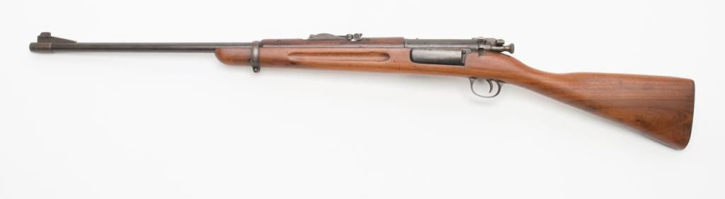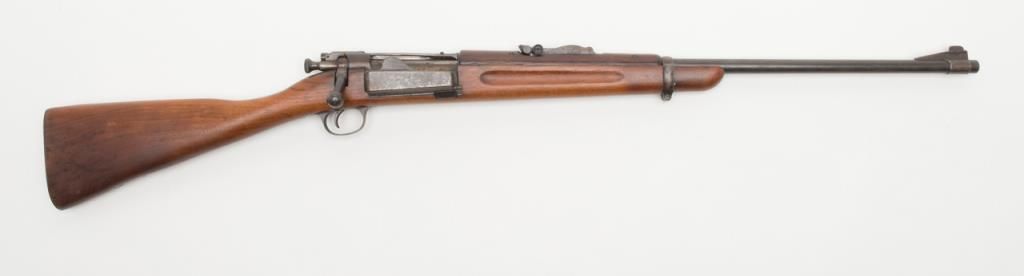 Springfield Armory Model 1898 Krag bolt action rifle, .30/40 Krag caliber, Serial #200611. The rifle is in overall very good condition with a 24” barrel. The barrel retains the majority of its blued finish with a tangent rear and ramp frontsight. The action retains a significant amount of flaking blued finish. The smooth wood stocks are in very good condition with small mars and two screw holes in the butt where the sling swivel was removed. The bore is good, the action tight andmarkings sharp on this rifle. (C+R/PPT). Est.: $175-$350.