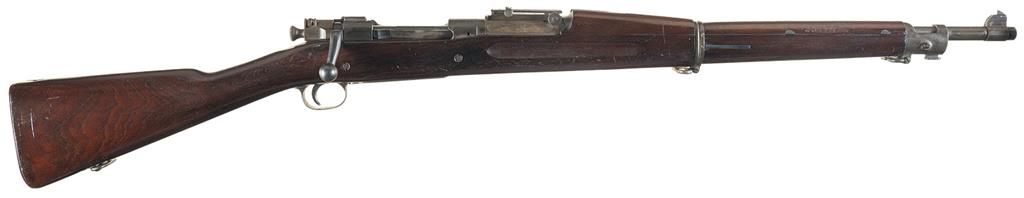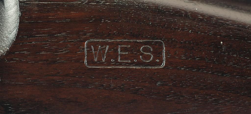 The receiver was manufactured in late 1937. The barrel is stamped "S A/flaming bomb/11- 42" and has the standard front and rear sights. The top flat of the bolt handle is stamped with an "X". Mounted on an earlier production World War I era smooth walnut straight grip stock with finger grooves, two reinforcing bolts, a boxed "W.E.S." cartouche, a circled "P" proofmark and a checkered steel buttplate.
