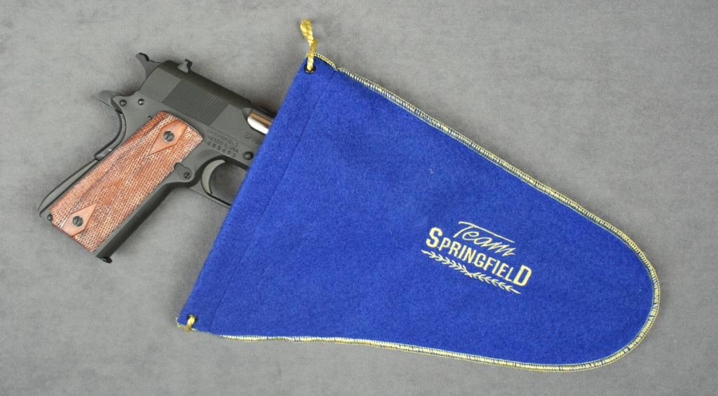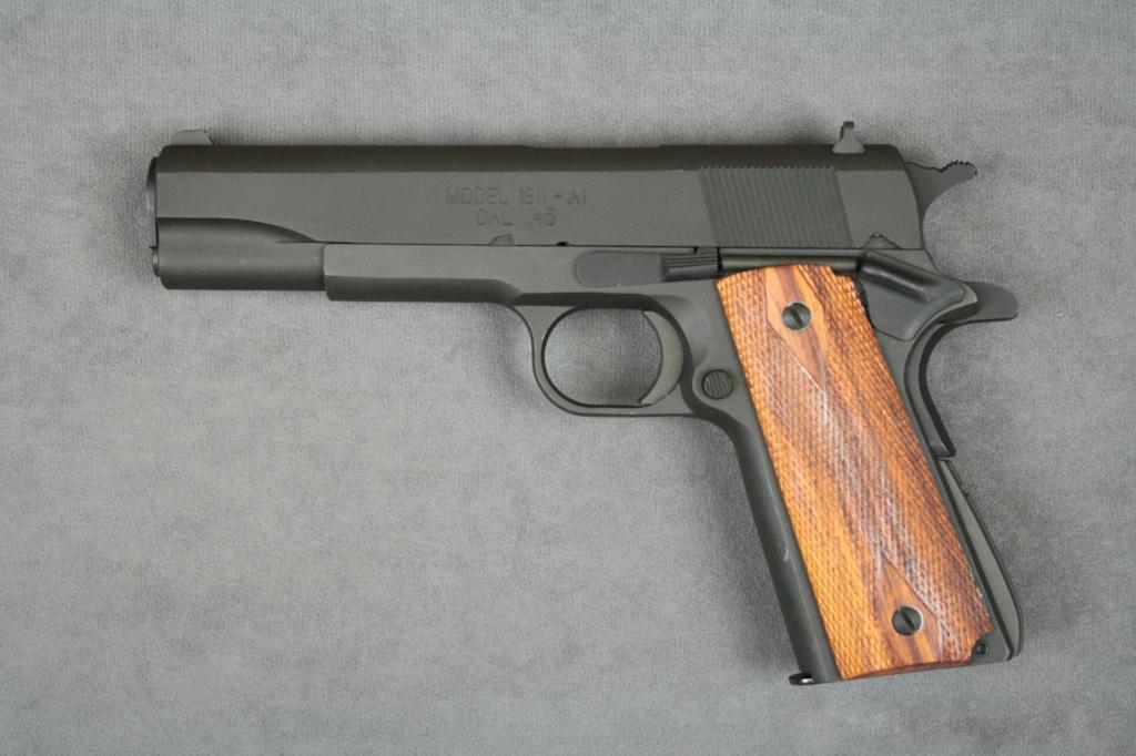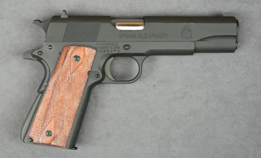 Springfield Armory Model 1911-A1 semi-auto pistol, .45 cal., 5” barrel, parkerized finish, checkered wood grips, #N433473. This gun is in like new condition and a popular model. Est.: $300-$600.