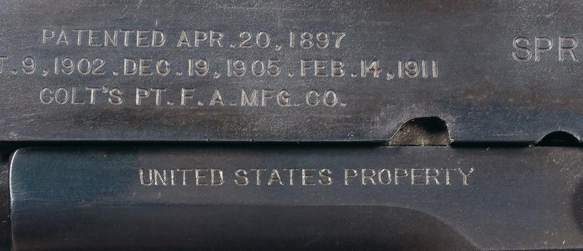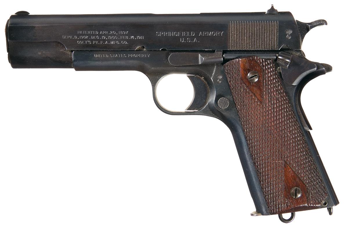 This Model 1911 Automatic Pistol was manufactured by the Springfield Armory in 1914. The pistol has the distinctive, lusterless, blue-black finish found on Springfield M1911 pistols and is fitted with checkered walnut stock with large diamonds surrounding the screw escutcheons. The pistol is fitted with a Springfield Armory two-tone magazine with lanyard loop floor plate. The pistol has the correct long hammer with rounded, knurled, spur and front sight that is an integral part of the slide. The right side of the slide is roll-stamped with the Springfield Armory eagle and shield motif behind the ejection port and "MODEL OF 1911.U.S.ARMY" in a single line in front of it. The left side of the slide is roll-stamped: "PATENTED APR. 20, 1897/SEPT.9, 1902.DEC.19,1905.FEB.14, 1911/COLT'S PT.F.A.MFG. CO. in a three line block followed by "SPRINGFIELD ARMORY/U.S.A." in two lines ahead of the grip serrations and the Ordnance "Shell and Flame' insignia behind the serrations. The serial number, "No 104418" is located on the right side of the frame behind the slide stop hole. A small 'Shell and Flame' insignia is stamped on the left side of the frame above the magazine release. The barrel is stamped with the Springfield heat lot "REP1" on the lower left side of the chamber and "S" and "P" on the left side of the lug. The markings indicate that the barrel is a Springfield Armory WWII replacement.