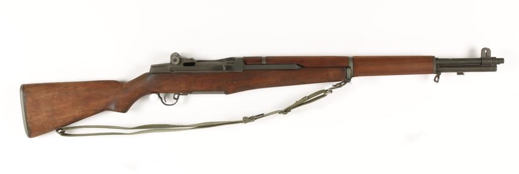 Popular WWII semi auto rifle with 24" barrel. Arsenal rebuild with parkerized refinished SA parts. Plain pistol grip wood military stock, shrouded front sight, adjustable rear aperture sight, bayonet lug, sling swivels, and green canvas web sling. Very good bore and action. Bolt handle marked "NM" Condition: Good to very good showing scratching and parkerized finish and one large dent in wood above trigger. *CURIO & RELIC FIREARM*