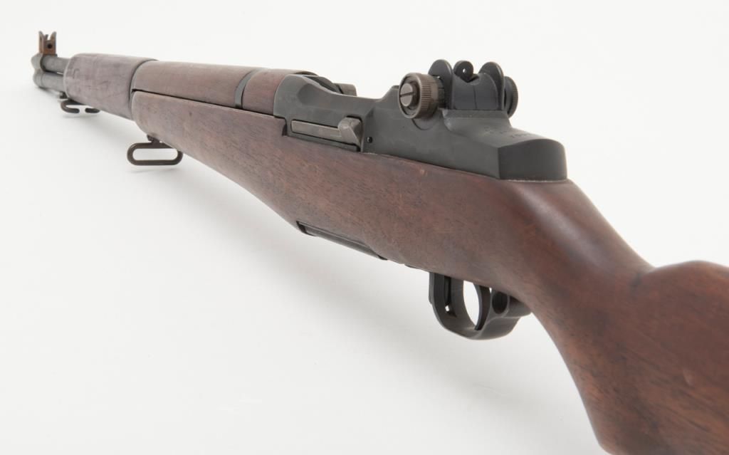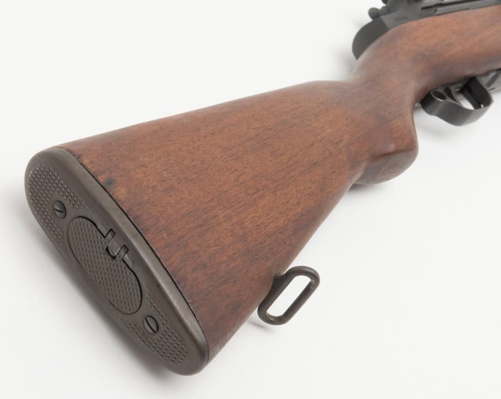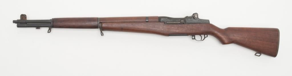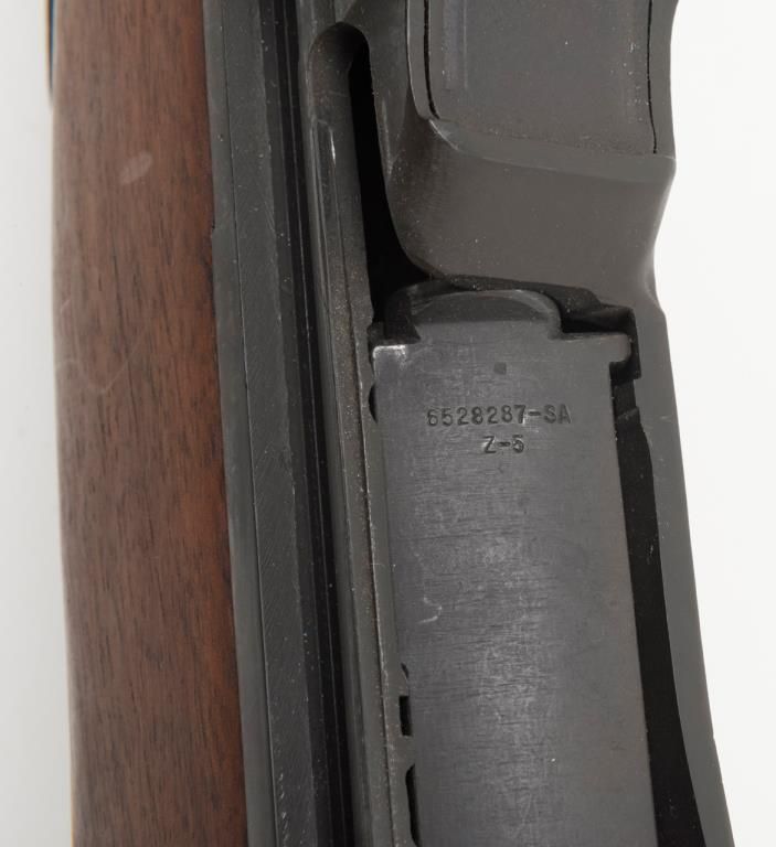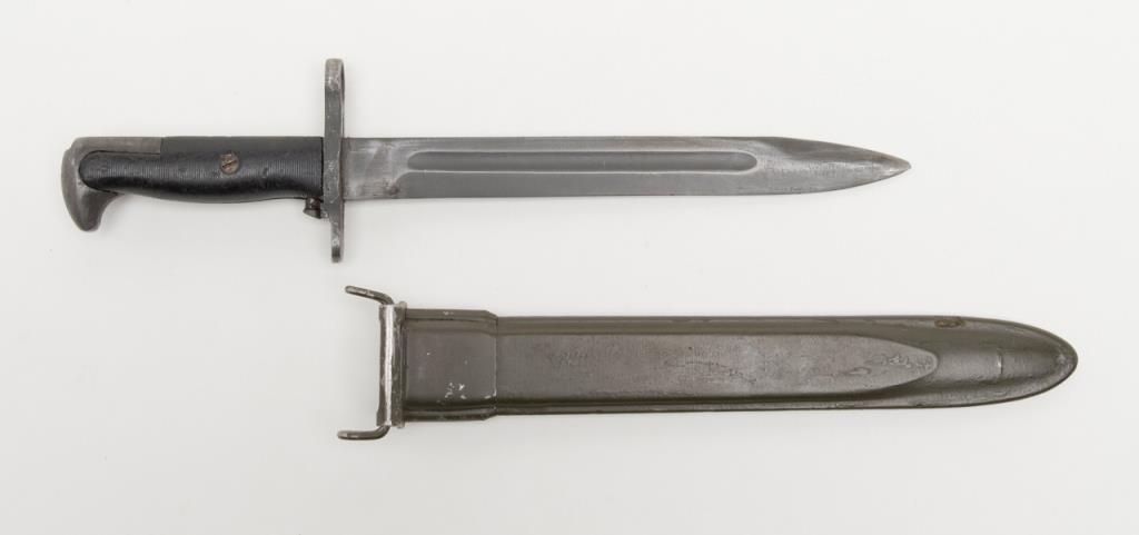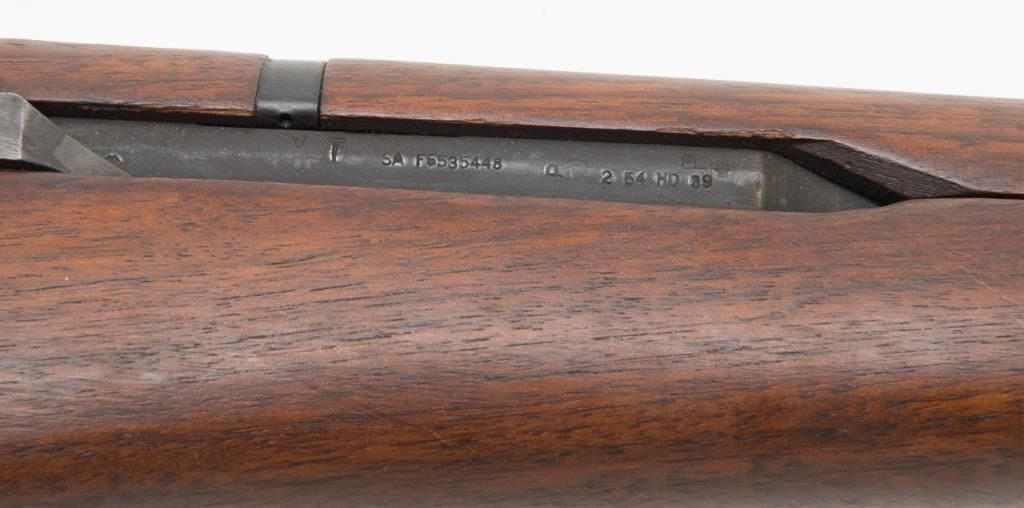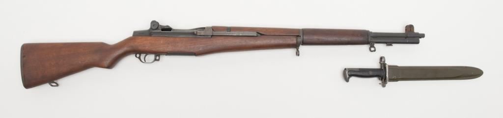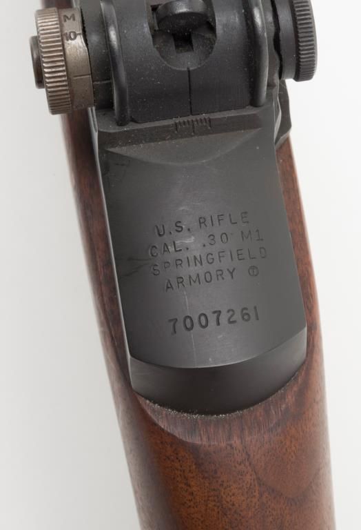 Springfield Armory U.S. M1 Garand semi-automatic rifle, caliber 30/06, Serial #7007261. The rifle is in overall very good condition with a 24” SA barrel dated “2 54”. The rifle retains the majority of its military finish with slingswivels, bayonet lug and metal trap butt plate. There is moderate surface rust on the front sight which may clean. The action retains nearly all of its finish and is embossed with four stars at right rear of the action. The smooth wood stocksshow no visible cartouches but are otherwise in very good condition with typical mars and compressions. The Bore is very good, the action crisp and markings sharp on this Garand. It includes a 15” bayonet and scabbard with the USFlaming Bomb insignia displayed. (C+R/PPT). Est.: $600-$1,200.