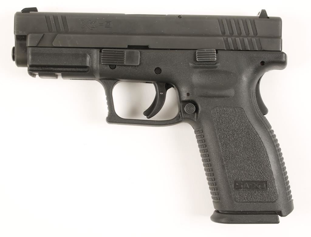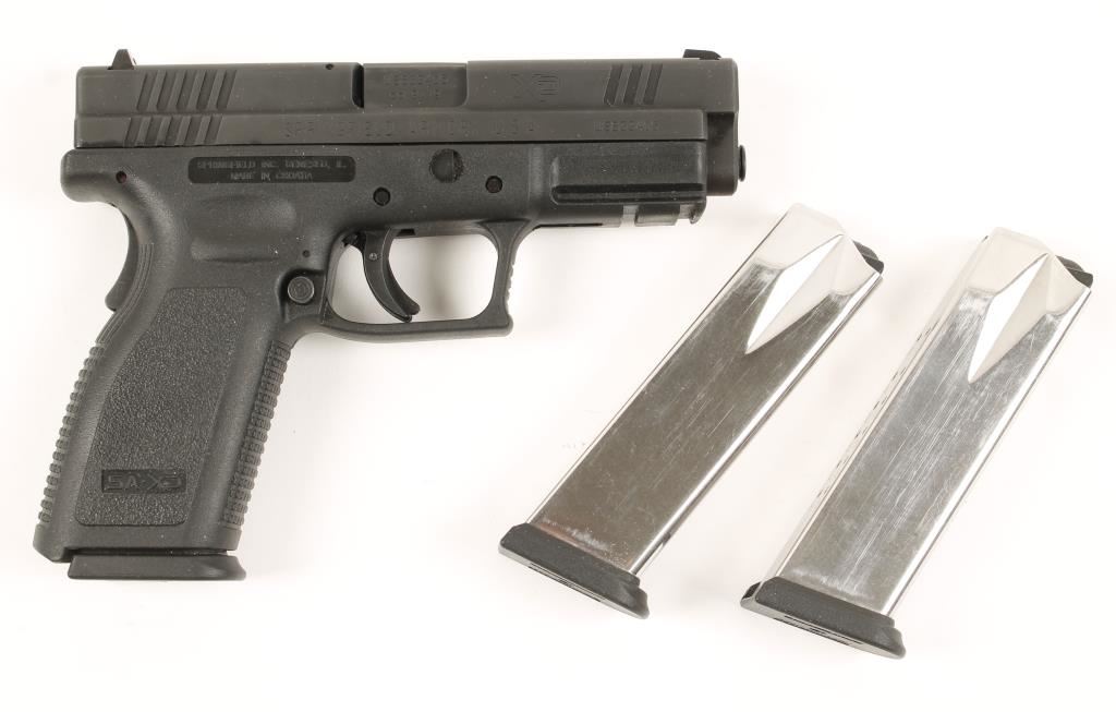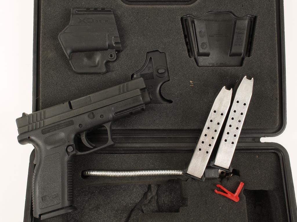Blued steel and polymer single-action semi-automatic hammerless pistol with a 4" barrel, three 16-round magazines, factory plastic case, cable lock, empty chamber indicator, documents, mag loader, holster and 2 place mag holder. Finish is good on steel and polymer. Three-dot sight. Cocked indicator. Accessory rail. Bore is shiny with sharp rifling. Function is good . Condition is very good. *Modern Firearm*