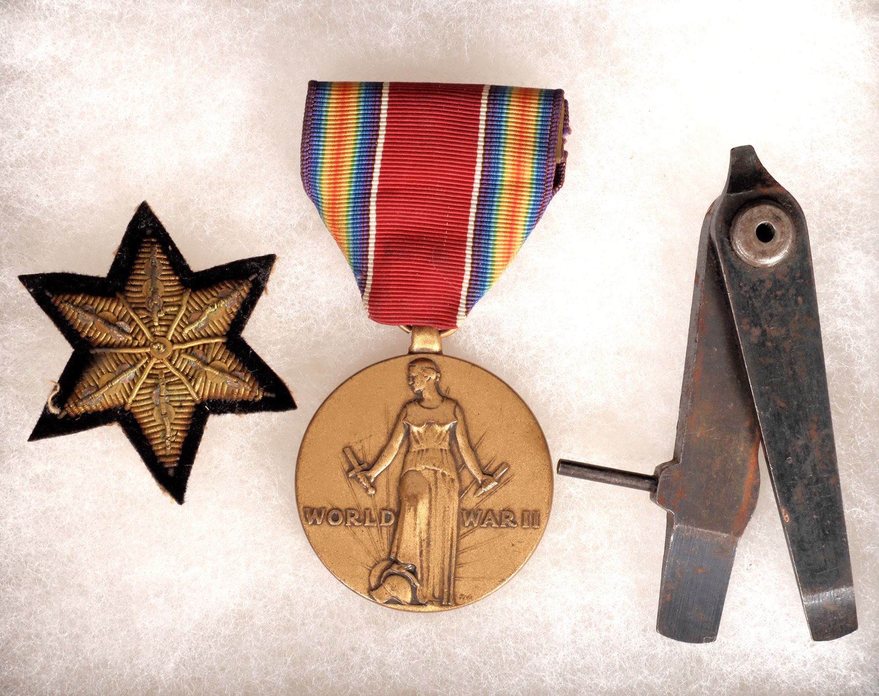 This shadowbox contains a 2nd version 1903 Springfield combination tool in used, original blued condition. It is accompanied by a 6 pointed gold thread star. This star was awarded to US Army troops for the liberation of Manila, Philippines during WW2. There is also a WW2 service medal included. 1903