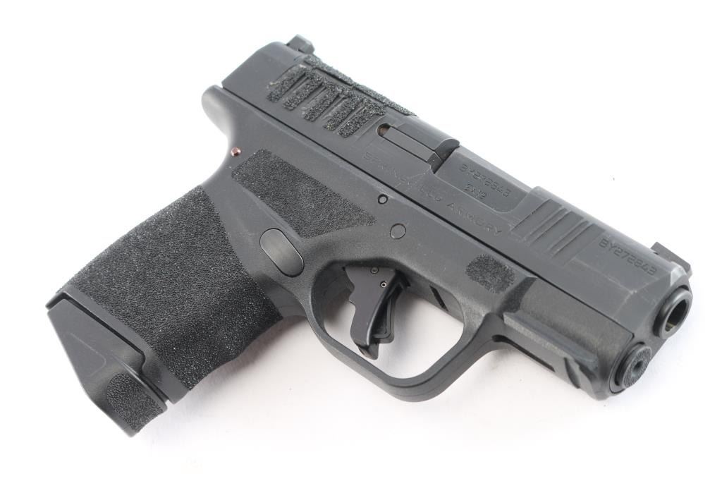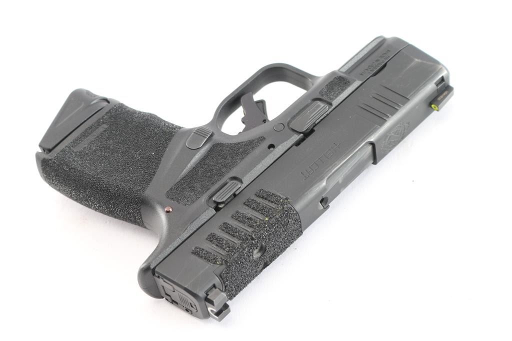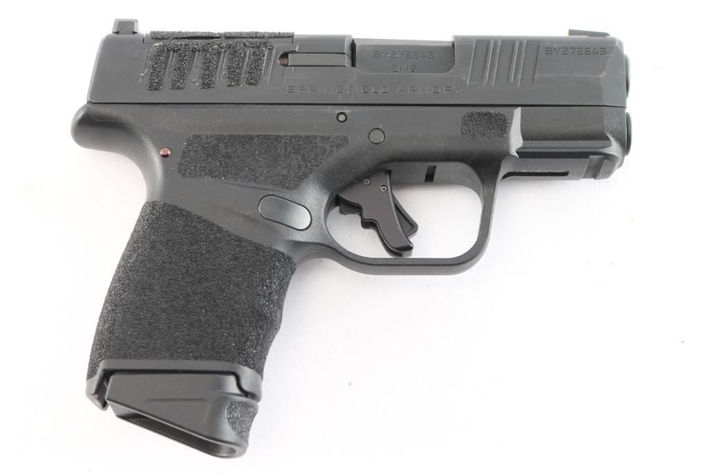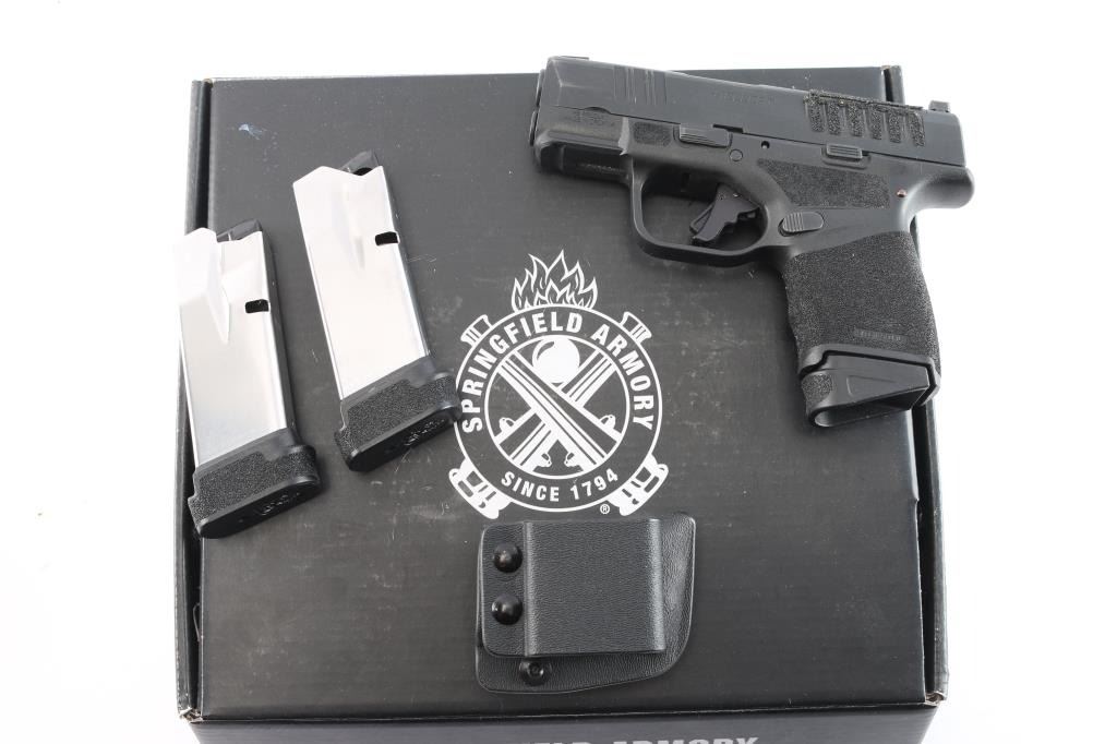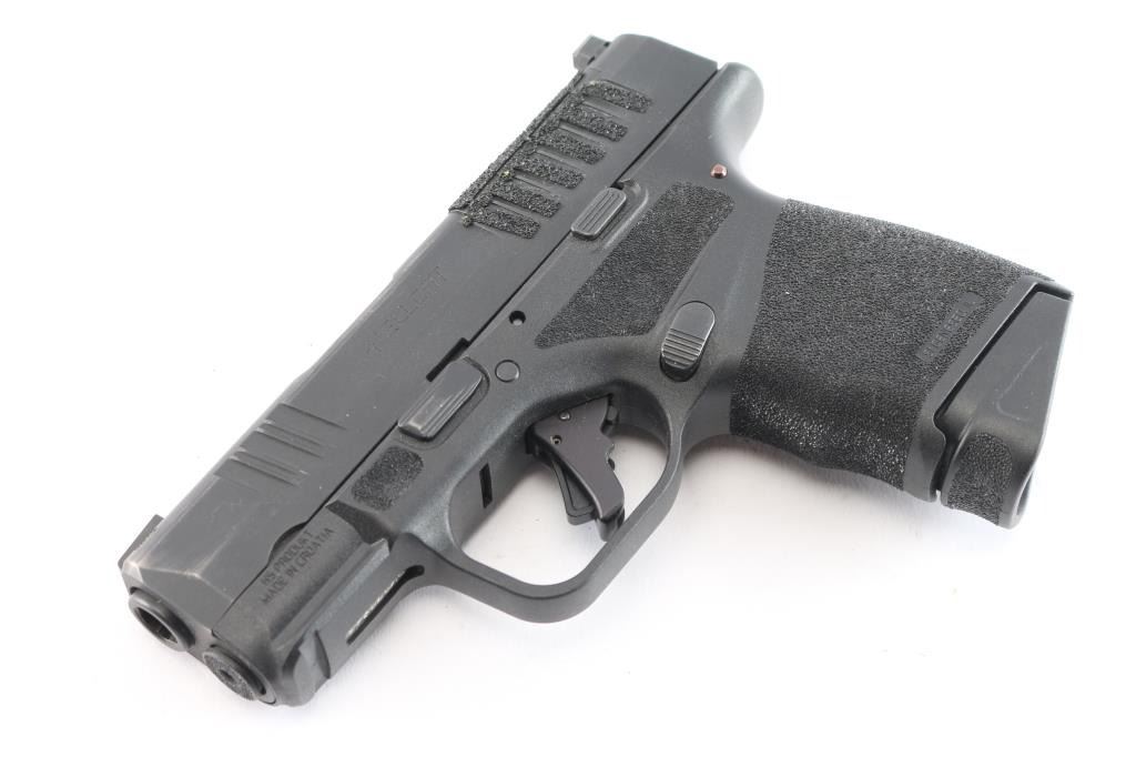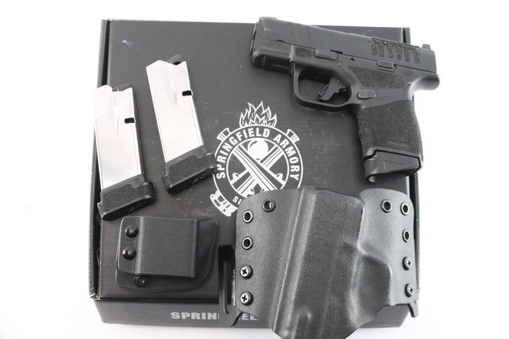 Croatian compact semiautomatic pistol imported by Springfield Armory, Geneseo IL. Features 3" barrel, fixed sights in dovetails, white dot front night sight, white outline "U" shaped rear sight, striker fired, manual safety in trigger, loaded chamber indication, accessory rail on dust cover. All black finish; polymer frame. Night sight insert is bright. Slide Spider grip material has been put on the rear of slide. One 11 rd magazine with finger rest Bore is excellent condition. Overall external condition is very good. Includes factory cardboard box, manual, cable lock, Red Gear black polymer holster, mag holder, Apex action enhancement trigger, two extended 15 rd magazines, and two 13 rd magazines, five magazines total.