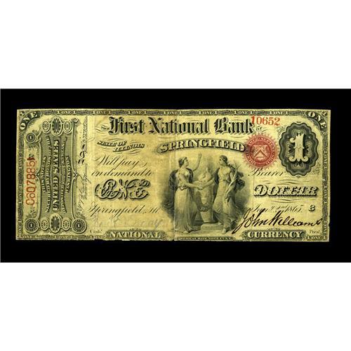 <B>Springfield, IL</B></I> - $1 Original Fr. 380 <B>The First NB</B></I> Ch. # 205<BR>This is one of only two First Charter Aces known from the Illinois state capital, with the other example being somewhat inferior to this specimen. There are a couple of minor repairs and a margin split or two, but overall, the note remains quite attractive for the assigned grade and merits the attention of every serious collector of Illinois Nationals. <B>Fine.</B></I><BR><BR><b>Shipping:</b> Coin/Currency (<a target="_blank" href="http://www.heritageauctions.com/common/shipping.php">view shipping information</a>)