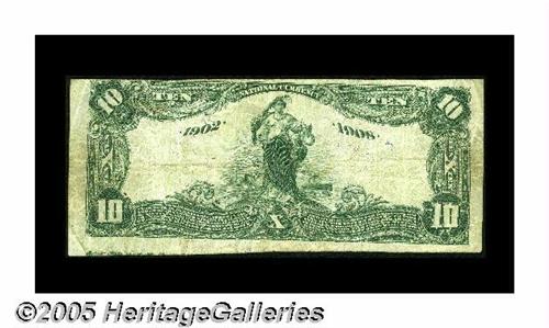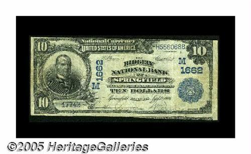 <B>Springfield, IL</B></I> - $10 1902 Date Back Fr. 618 <B>The Ridgely NB</B></I> Ch. # (M)1662<BR>This institution closed its doors forever in 1919. The example we make available tonight is <B>Fine-Very Fine</B></I> with the stamped officers' signatures still evident. The trim was a bit sloppy, however, leaving a portion of the note below showing.
