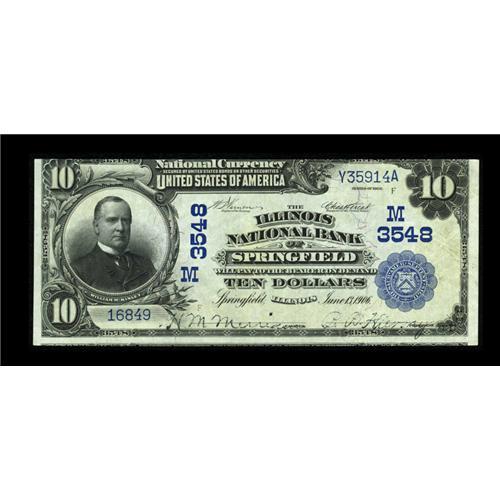 <B>Springfield, IL</B></I> - $10 1902 Plain Back Fr. 618 <B>The Illinois NB</B></I> Ch. # (M)3548<BR>Dark inks, stamped signatures, and original paper surfaces adorn this state capital $10. The top edge is inside the frame line and the bottom edge is inside the adjacent note. The census contains only one large graded note with a higher grade than this unreported $10. <B>Extremely Fine,</B></I> with original surfaces.<BR><I>From The Lincoln Collection</B></I><BR><BR><b>Shipping:</b> Coins & Currency (<a target="_blank" href="http://www.heritageauctions.com/common/shipping.php">view shipping information</a>)