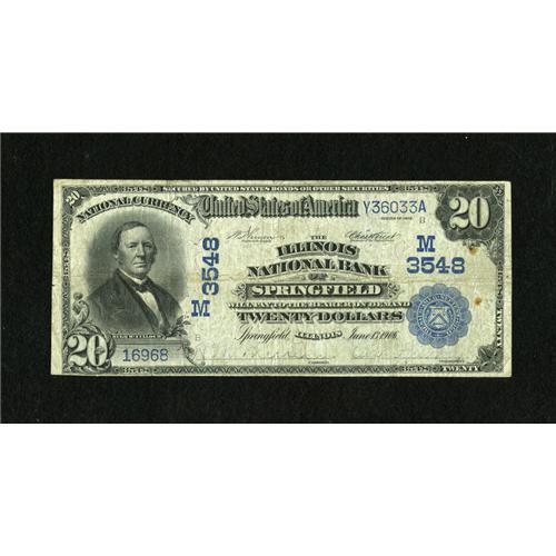 <B>Springfield, IL</B></I> - $20 1902 Date Back Fr. 644 <B>The Illinois NB</B></I> Ch. # (M)3548<BR>This Date Back has solid eye appeal, though there are two spots where a staple once resided. <B>Very Good.</B></I><BR><I>From The Lincoln Collection</B></I><BR><BR><b>Shipping:</b> Coins & Currency (<a target="_blank" href="http://www.heritageauctions.com/common/shipping.php">view shipping information</a>)