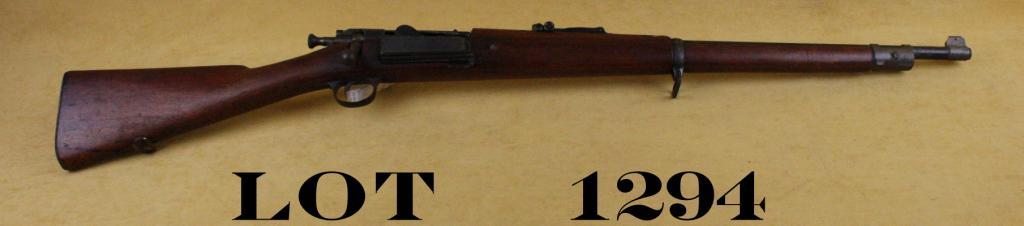 Springfield-Krag model 1898, .30-40 caliber, bolt action rifle. Serial #237015. Barrel has been reduced to 24”, the stock shortened, possibly for constabulary or paramilitary forces. Good metal, sharp cartouche, goodbore. Est: $200 - $400