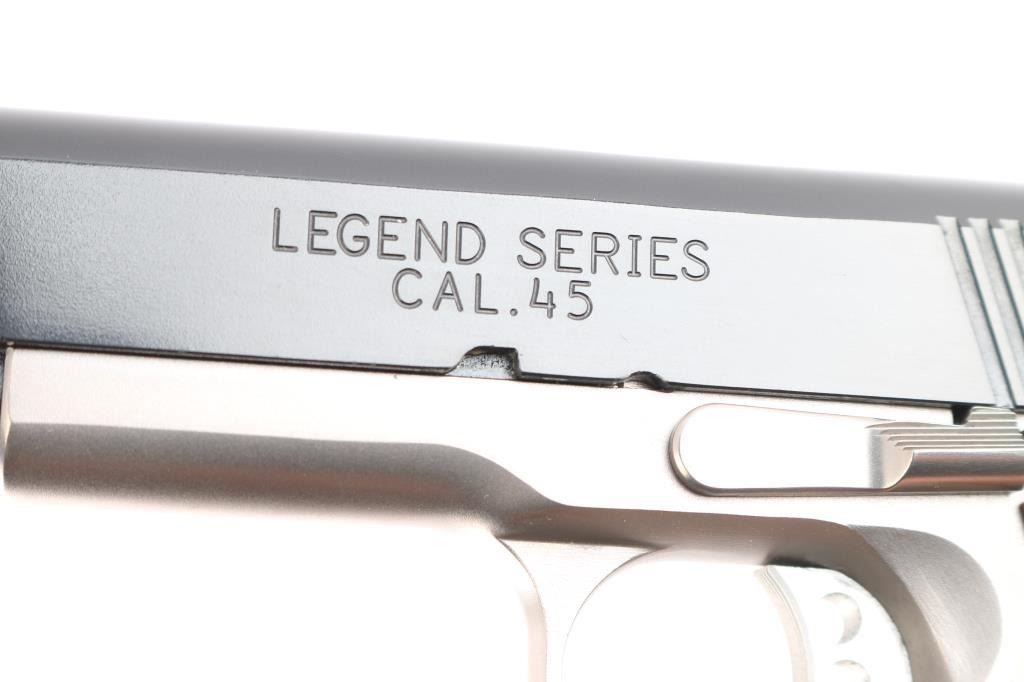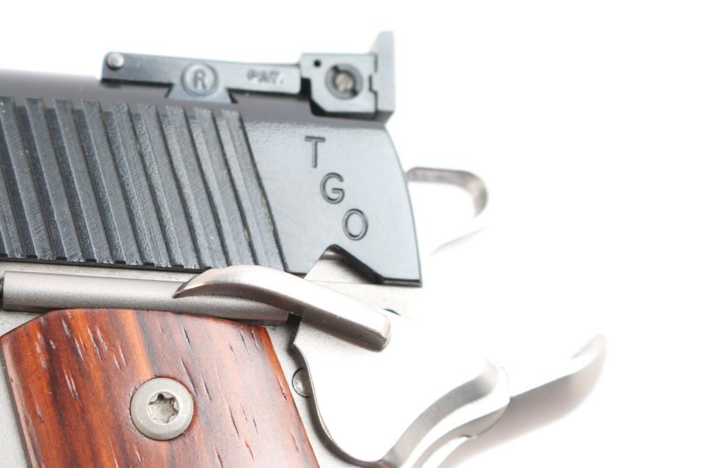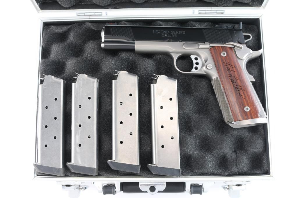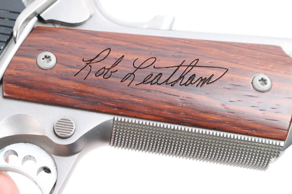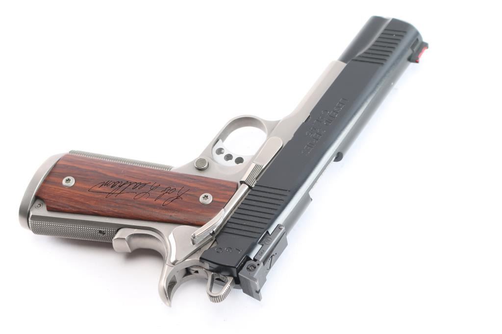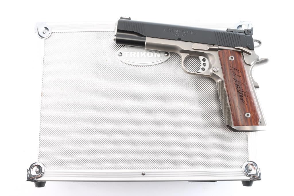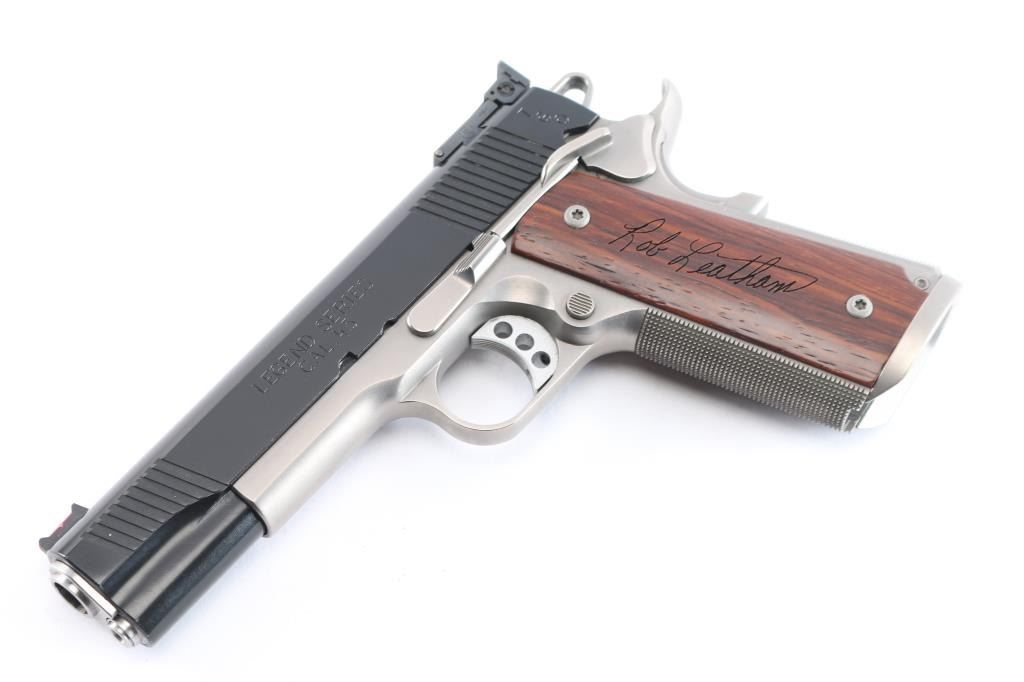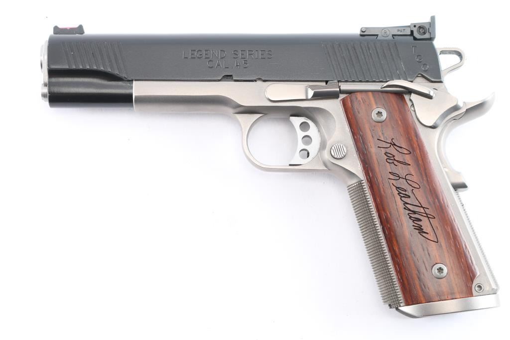 American made Leatham Legend TGO 1911 chambered in .45 ACP and manufactured in Geneseo, IL. The TGO comes with a five-inch throated national match stainless-steel barrel and matched bushing, deluxe low-mount BoMar adjustable rear sight, Dawson fiber-optic front sight, a skeletonized trigger, skeletonized hammer with serrated hammer spur, and four total magazines. It features a two-tone finish, polished feed ramps, two piece stainless steel guide rod, front and rear slide serrations, 'Rob Leatham' engraved wood grips, checkered front-strap, checkered mainspring housing, flared magazine well, serrated push-button magazine release, smooth extended beavertail grip safety, and extended ambidextrous safety. The total finish has approximately 98% intact remaining and showing a very small amount of edge wear on the front of the slide, and a tiny round spot of missing finish on top of the slide. The bore and action are excellent. The grip screws protrude into the magazine well, and are raised above the grip panels which makes magazine insertion impossible. A serious pistol for serious shooters, and Rob Leatham has put his name on it. This comes with a hard lockable box, an extra set of grips, owners manual, sticker, a small bag of tools, a certificate of authenticity, a Robar metal finish warranty, and an autographed photo and letter from Rob Leatham himself.