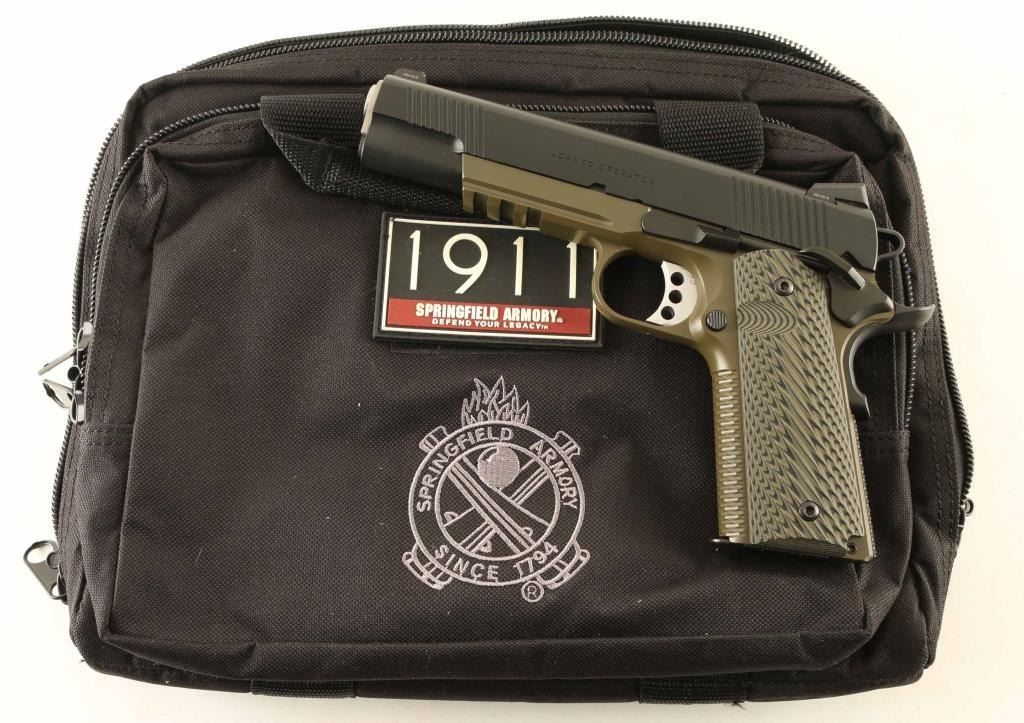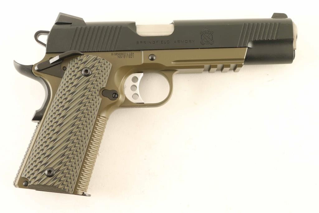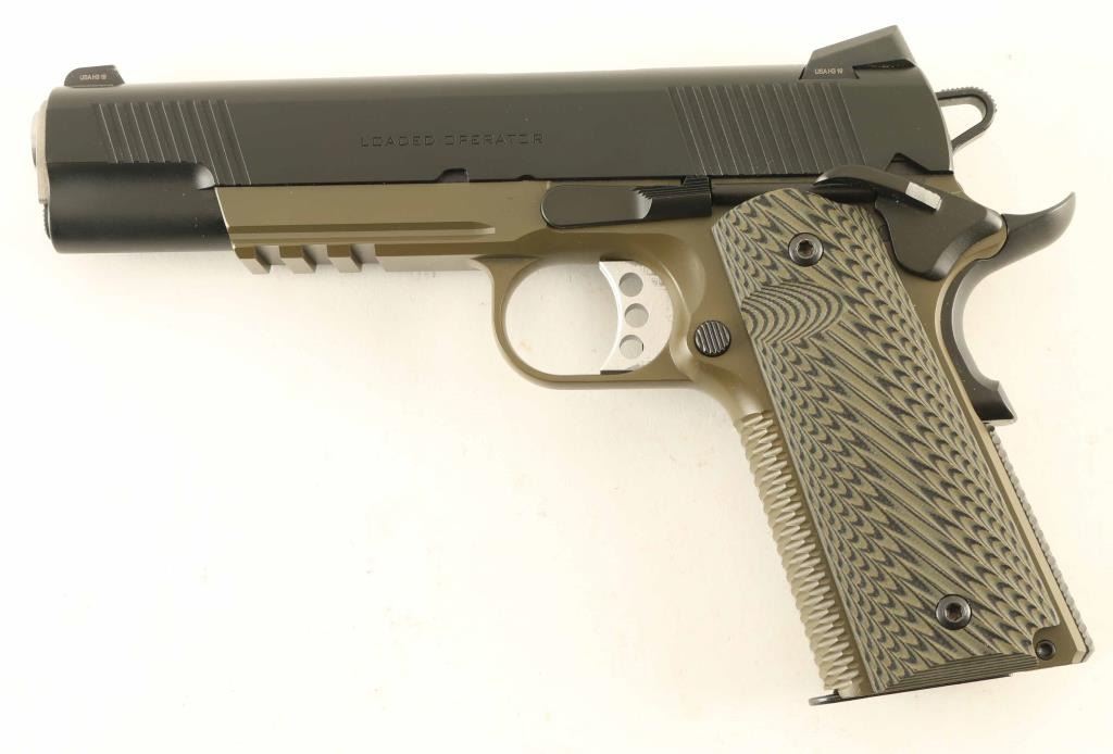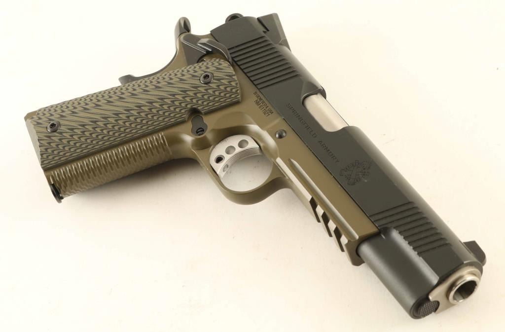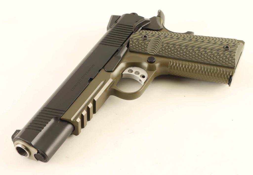 SN: NM611921 High quality 1911A1 pattern single action semi-automatic pistol. Features a black Armory Kote finished slide with fore and aft cocking serrations, 5" match grade stainless steel barrel, fitted barrel bushing, dovetailed three-dot night sights, serrated aluminum trigger with overtravel adjustment, skeletonized hammer, ambidextrous extended safety on the frame, upswept beavertail grip safety with memory bump, push button magazine release, olive drab finished steel frame with integral accessory rail, knurled flat mainspring housing, green/black laminate G10 composition grips panels. Overall condition is like new with few signs of handling. Night sights have strong glow. Includes (1) magazine, black nylon soft case. Condition is NRA Excellent- like new *** Modern Firearm ***