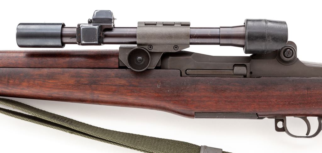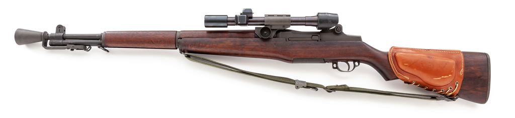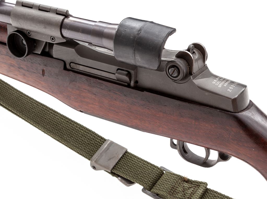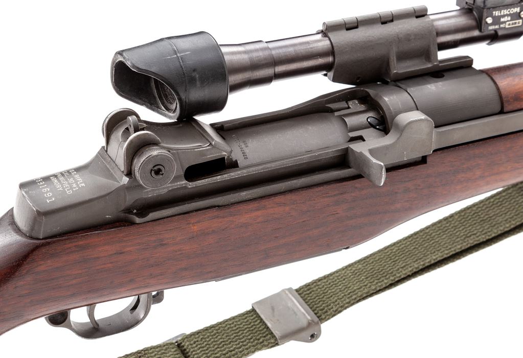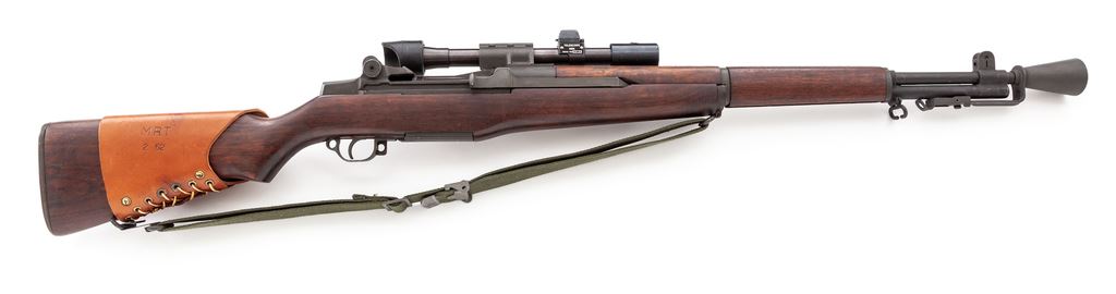 U.S. M1-D Garand Semi-Automatic Sniper Rifle, by Springfield Armory, #2891691, .30-06 cal., 24'' barrel marked ''S-A-9-52'', parkerized finish, WWII cartouched walnut stock, 2-52 dated MRT marked leather cheekpiece, and U.S. M84 telescopic sight with rubber eye cup and sunshade. Rifle additionally features post-war green canvas sling, green canvas M65 scope cover, and M2 flash hider by Hart Mfg. Co. Butt trap contains oiler, cleaning rod and combination handle. Receiver was originally mfg'd in late Spring 1944. Walnut stock is lightly cartouched with what appears to be ''S.A./GAW'', which is the correct factory stock for this receiver number. Includes CMP paperwork serialized to this firearm. (Ref. the book, ''The M1 Garand 1936 to 1957'', page 189, by Joe Poyer and Craig Riesch.) Condition is excellent with one small impression beneath scope attaching nut to left side of stock. Finish has only thinned at highest edges of sight protector and tip of op-rod handle. Rear portion of chamber area is bright. Action is tight, bore is mirror bright, and scope optics are clear. Est.: $2,500-$4,000. (C&R) (Joe Poyer collection)
