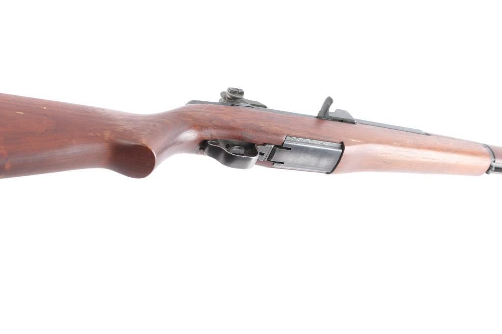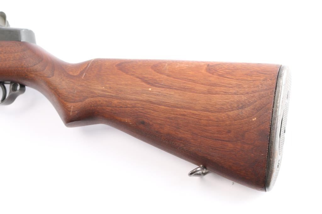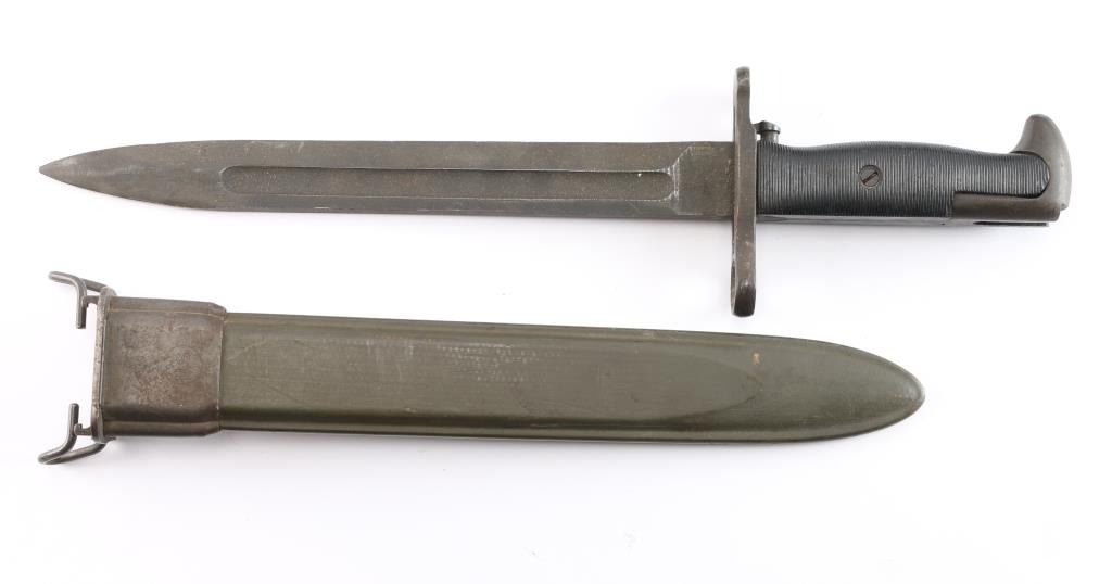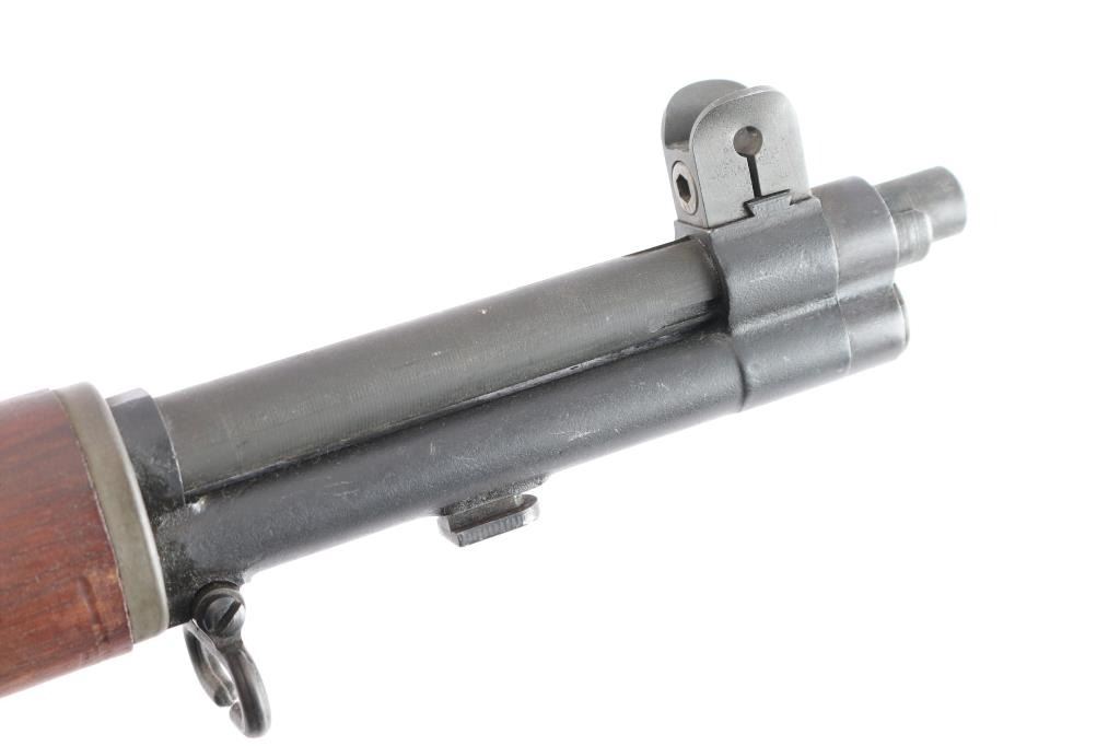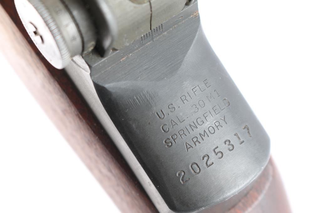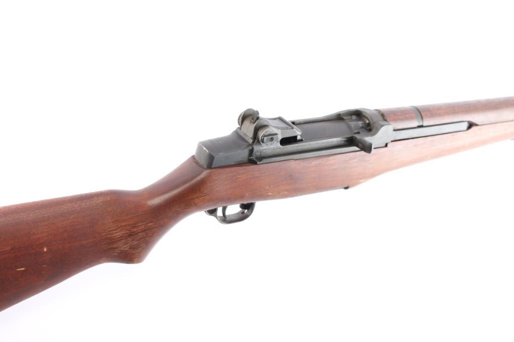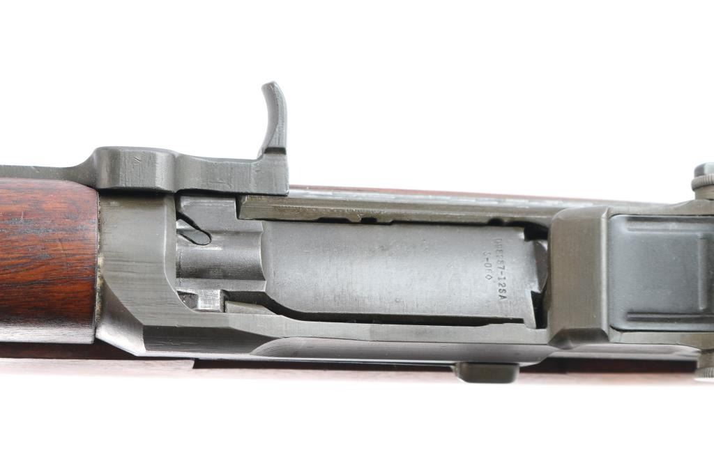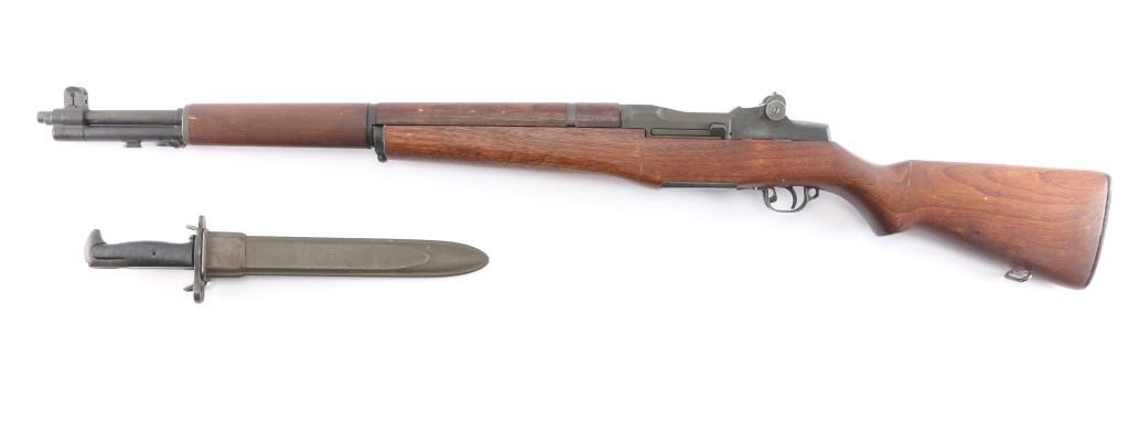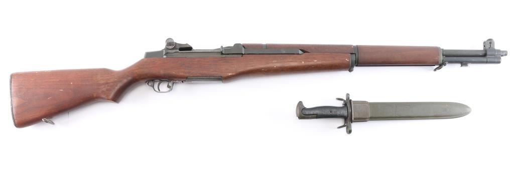 US military gas operated semi-automatic rifle chambered in .30-06 Springfield, manufactured circa 1943. The workhorse rifle of the US military in WWII and beyond. Featuring a parkerized finish, 24" barrel, protected adjustable rear aperture sight, protected front blade sight, fixed magazine for en-bloc clips, milled trigger guard, manual safety in trigger guard, and smooth curved trigger. The hardwood furniture consists of a smooth semi-pistol grip stock, smooth forend, checkered metal trapdoor buttplate, buttstock storage compartment, and smooth handguards. Barrel marked "2-S-A-10-43," bolt marked "D28287-12SA and S-06(diamond)," "D28290-W.R.A." marked trigger housing, and "D35382 9 SA" on the operation rod. Bore is bright with strong rifling. The original parkerized finish remaining is approximately 90% coverage with edge losses, and some minor scattered scratches. Although, various metal parts show different shades of parkerized finish with the trigger guard and magazine floor showing mostly bare metal. The wood is in good condition with some scratches, finish thinning, and scattered nicks or blemishes leaving light spots. The action is smooth and crisp. Includes proper type USGI bayonet and scabbard.