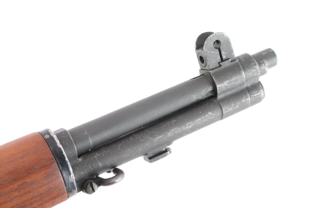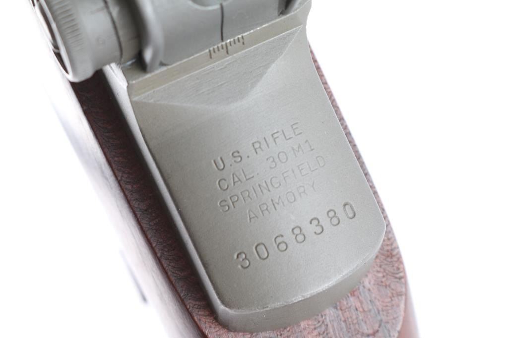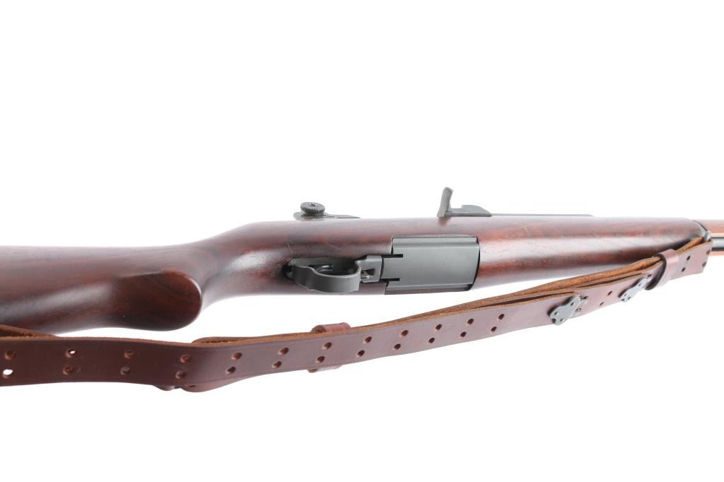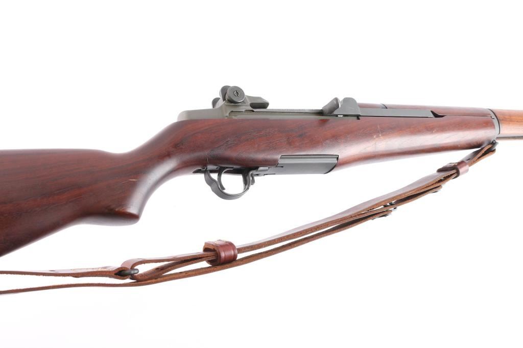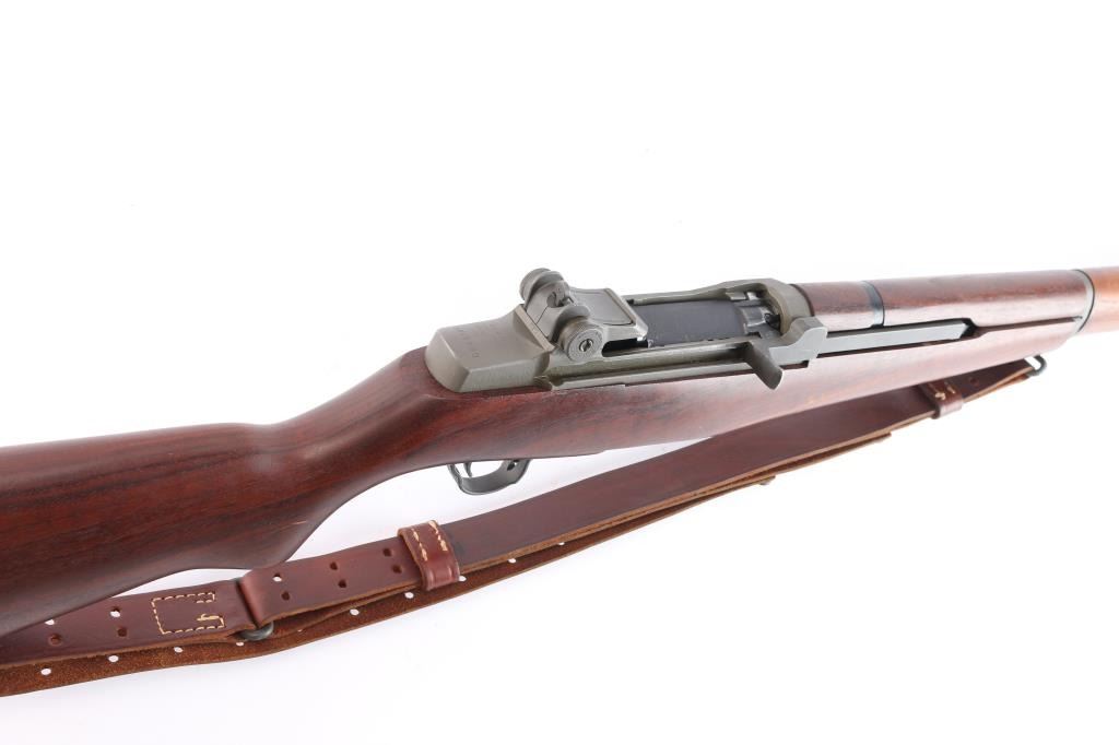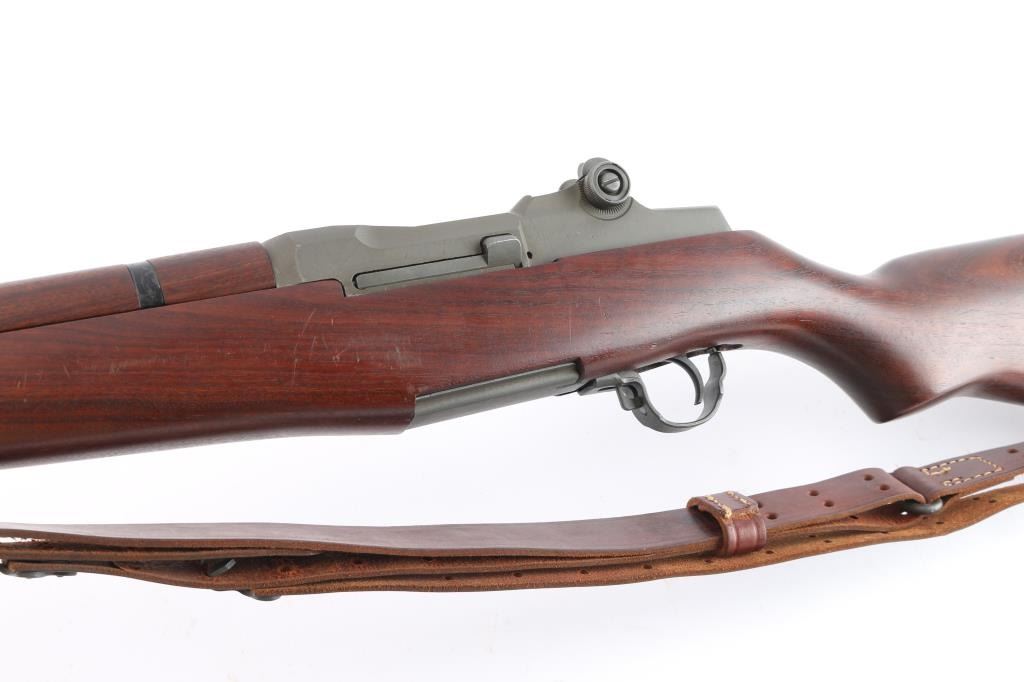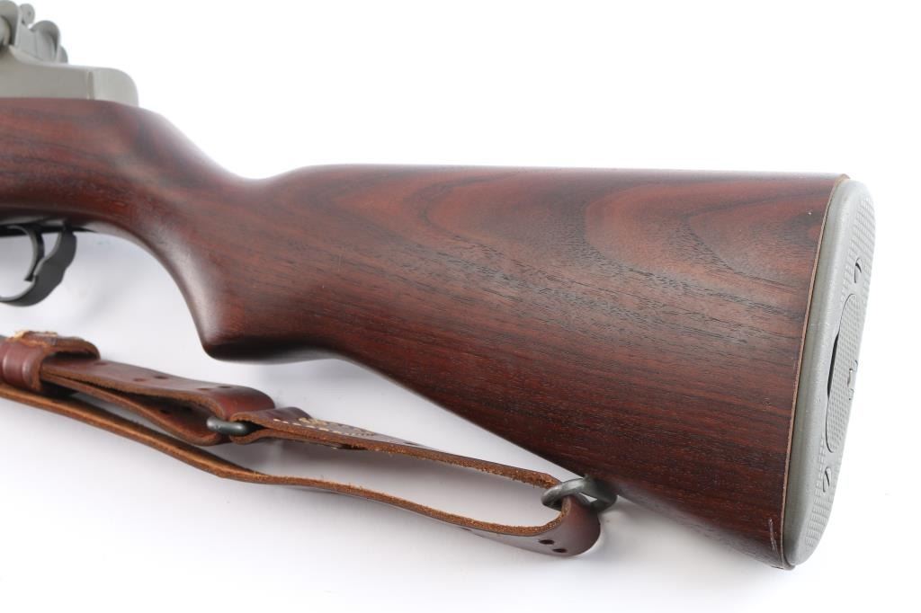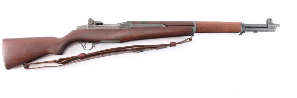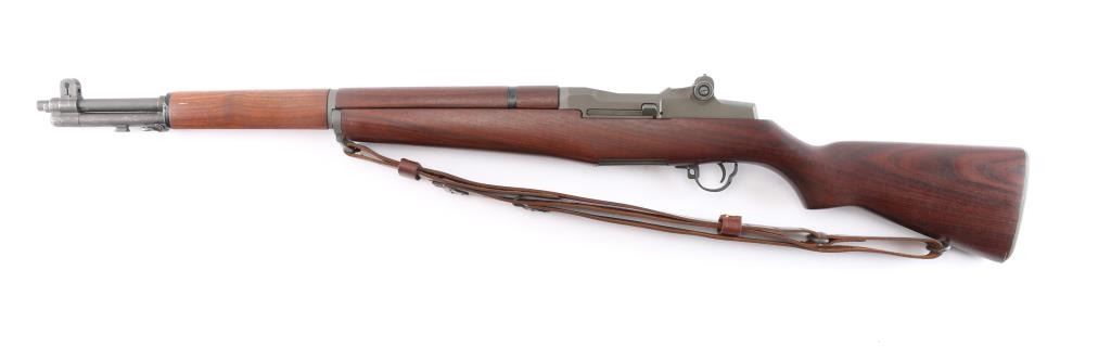 US military semiautomatic rifle manufactured. Arsenal reworked. Features parkerized finish, wood stock & hand guards, 24" barrel, adjustable sights with protected front blade & protected rear peep, fixed magazine for en-bloc clip, manual safety. Serial number dates the receiver to July 1944, bolt marked "D28287-12S-A -10", barrel marked "S-A 5-51",(Korean War) trigger housing marked "D28290-14-SA", Safety latch marked "C46015-9 SA", Op rod marked "D35382 SA". receiver marked "B31 C" over "D 28291 35", post war USGI Rear Sight Pinion stamped NHC(New Haven Clock) ,T105E type which is in yards. Bore is very good/bright ,strong rifling. Metal parts retain 95% medium gray/blue finish. Shows edge losses & handling marks. Wood is very good, some scartches. Stock cartouches not observed. After market M1907 type sling attached. USGI cleaning gear in butt.