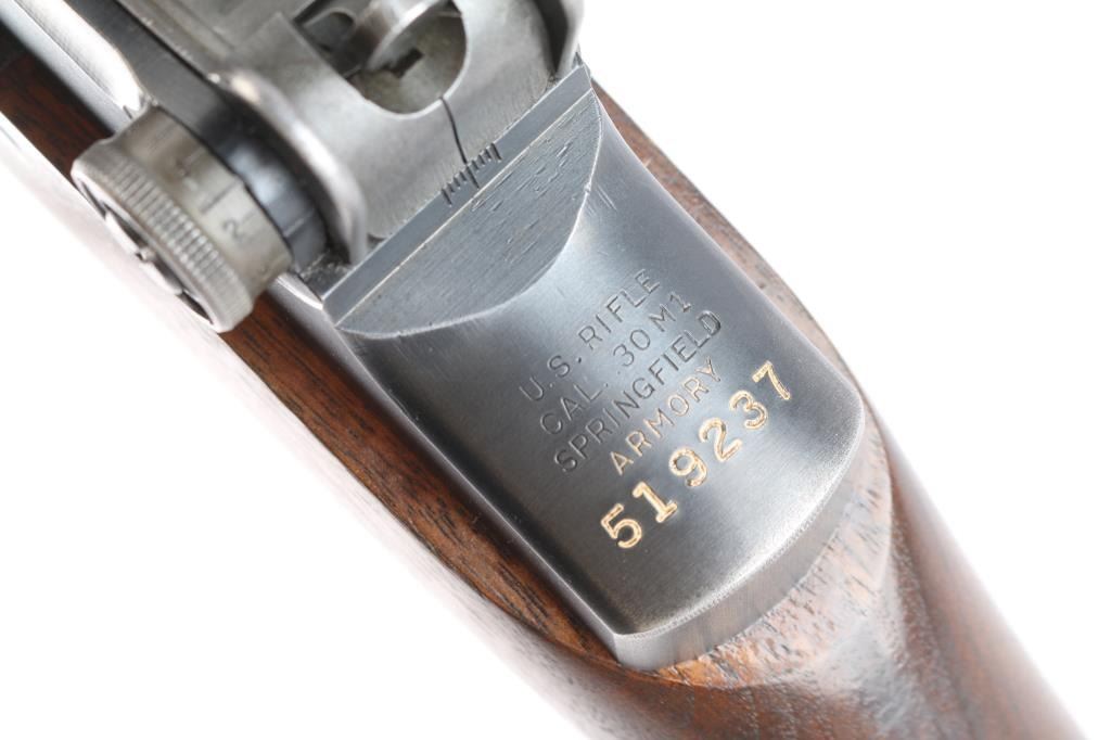 US military semiautomatic rifle. Arsenal reworked. Features blued finish, wood stock & hand guards, 24" barrel, adjustable sights with protected front blade & protected rear peep, fixed magazine for en-bloc clip, manual safety. Serial number dates the receiver to February 1942, bolt marked "D28287-17SA -B4C", barrel marked "S-A 4-49", trigger housing marked "90-HRA N65282, hammer marked "HRA 5546008. safety marked "HRA' , Op rod marked "D36382 3 SA", receiver marked "REP 25 C T over "D 28291-17". Rear sight marked "DRC". Bore is excellent/bright strong rifling. Metal parts retain 90% blue finish. Shows edge losses & handling marks. Wood is very good, color match among the stock and handguards. Some surface rust on the buttplate. Stock cartouches not observed. USGI green web sling attached.