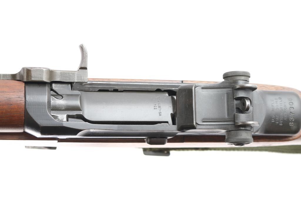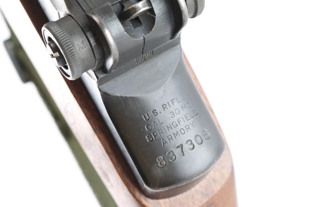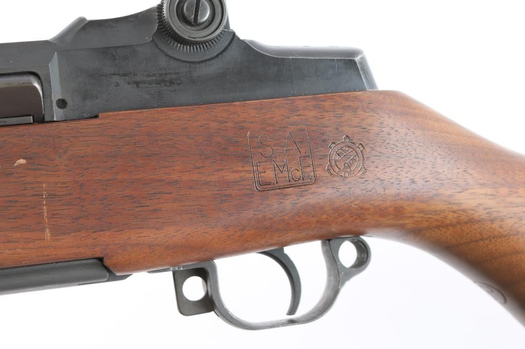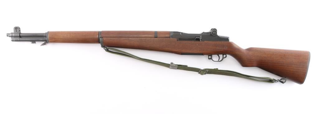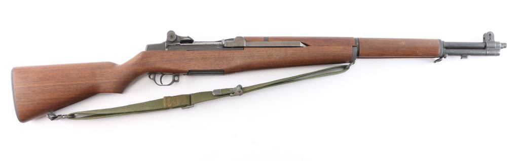WWII era U.S. military contract clip fed semi-automatic service rifle chambered in .30-06 Springfield. Manufactured in Springfield, MA by the Springfield Armory circa 1942 and subsequently rebuilt. Features a parkerized finish, Winchester proofed 24" barrel, shrouded blade front sight, adjustable rear aperture sight, bayonet lug, stacking swivel, SA marked trigger housing with smooth curved trigger & milled trigger guard, manual safety in the front of the trigger guard, SA marked bolt & op rod, green canvas sling, and Boyds three-piece smooth walnut stock set with circled “P”, [crossed cannons], & boxed "S.A./E.McF." on the buttstock along with a trapdoor metal buttplate containing oiled & cleaning kit. Rifle retains approximately 85% of its military finish showing edge wear, contact wear on the receiver & bolt and some scattered rust tones. The action is mechanically sound, the bore is excellent, and the modern walnut stocks are excellent with minor blemishes.
