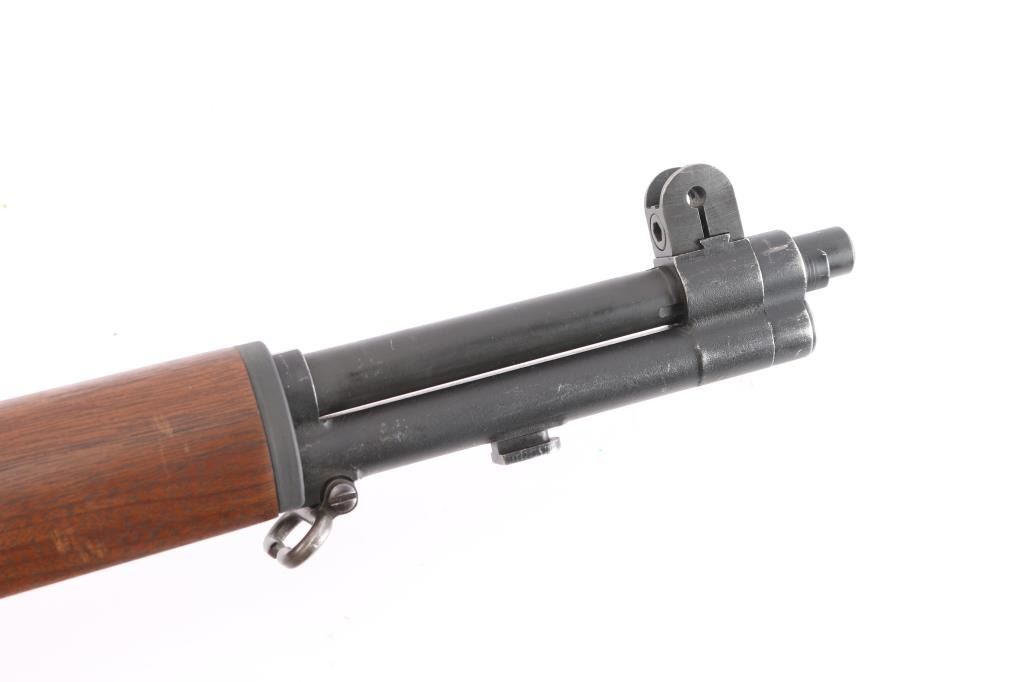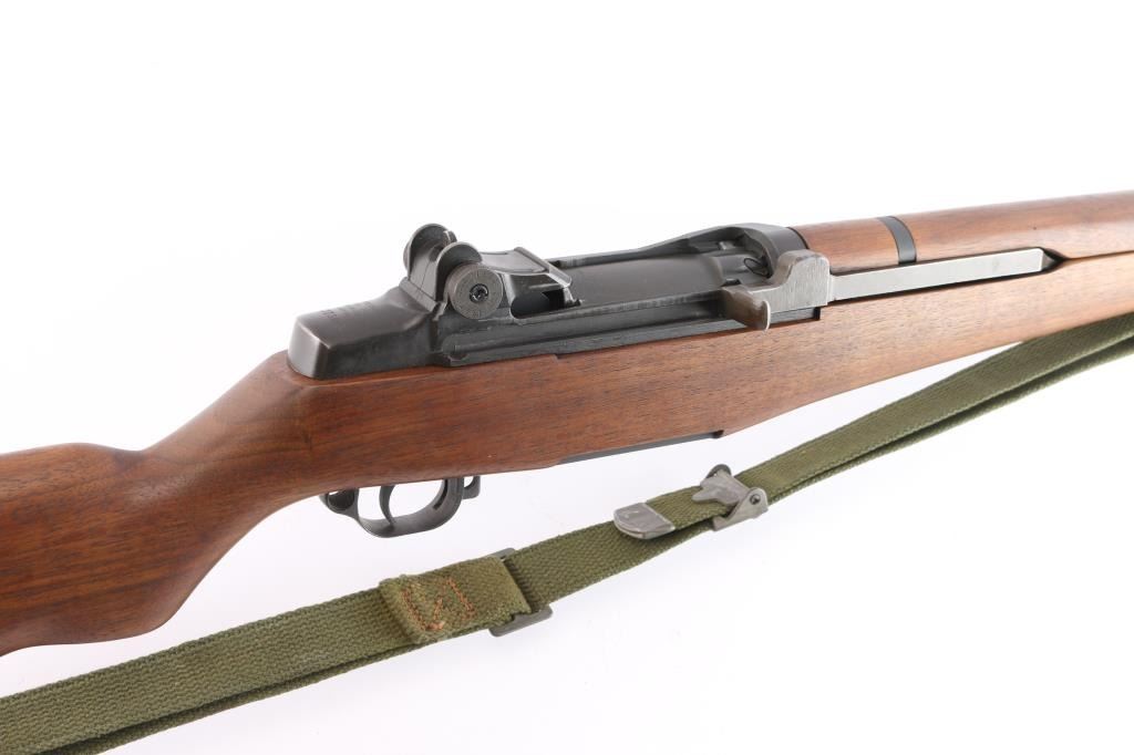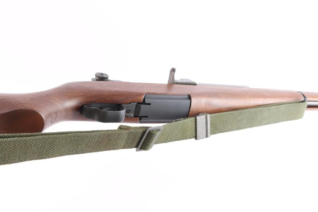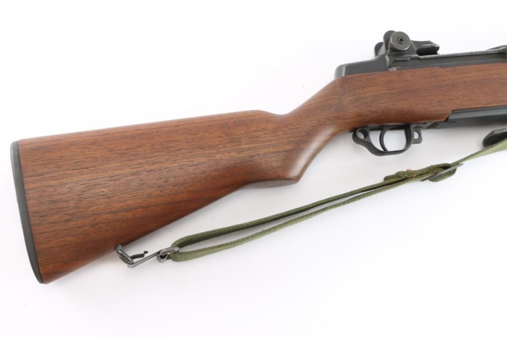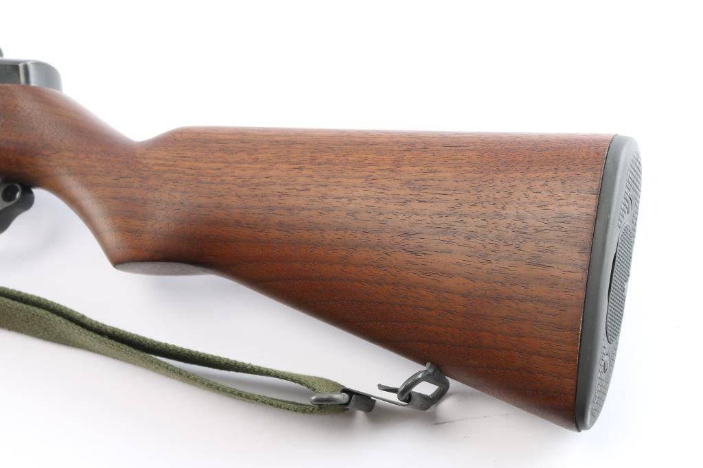 WWII era U.S. military contract clip fed semi-automatic service rifle chambered in .30-06 Springfield. Manufactured in Springfield, MA by the Springfield Armory circa 1942 and subsequently rebuilt. Features a parkerized finish, Winchester proofed 24" barrel, shrouded blade front sight, adjustable rear aperture sight, bayonet lug, stacking swivel, SA marked trigger housing with smooth curved trigger & milled trigger guard, manual safety in the front of the trigger guard, SA marked bolt & op rod, green canvas sling, and Boyds three-piece smooth walnut stock set with circled “P”, [crossed cannons], & boxed "S.A./E.McF." on the buttstock along with a trapdoor metal buttplate containing oiled & cleaning kit. Rifle retains approximately 85% of its military finish showing edge wear, contact wear on the receiver & bolt and some scattered rust tones. The action is mechanically sound, the bore is excellent, and the modern walnut stocks are excellent with minor blemishes.