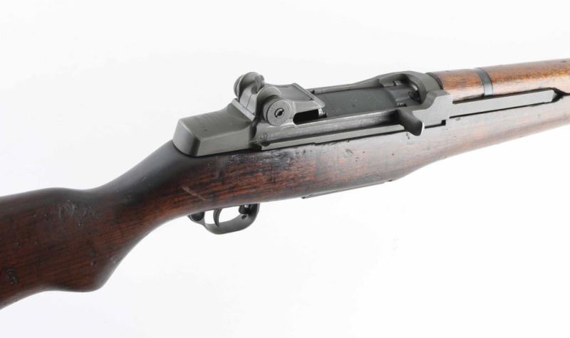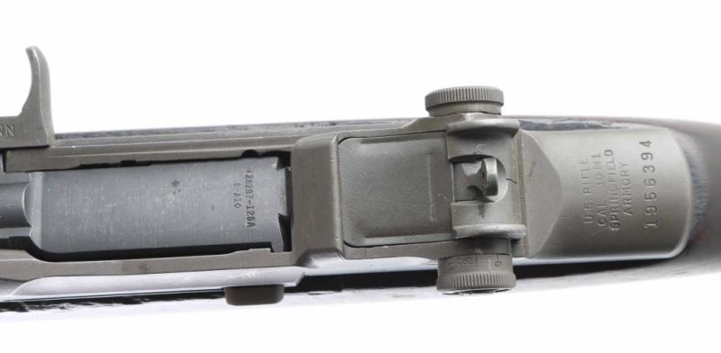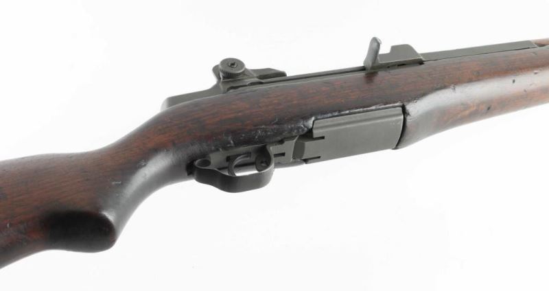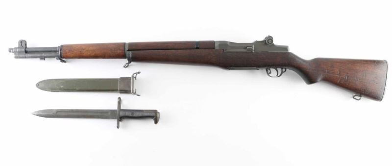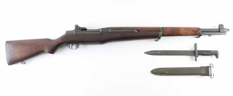 US military semiautomatic rifle manufactured circa 1943. Features parkerized finish, wood stock & hand guards, 24" barrel, adjustable sights with protected front blade & protected rear peep, fixed magazine for en-bloc clip, manual safety. Bore is good condition, fairly bright with some dark spots that might clean out. Metal parts retain 85% finish (appears refinished), with scratches and scrapes, edge wear, scrapes & scratches near muzzle. Color is generally matching medium gray with slight brown or greenish tint. Several retaining clips for hand guards have black paint over parkerized finish, with some loss of paint. Wood is good serviceable condition, with dents & nicks, appears lightly sanded and refinished with a slightly glossy sheen, no stamps or cartouches observed. No importer marks observed. All observed parts marked "SA", several appear later replacements. No markings on barrel visible under op rod. Includes partial GI type cleaning kit in butt trap, fair condition "PAL" and "U(flaming bomb)S" marked M1 bayonet with scabbard. Condition is NRA Very Good (arsenal refinished) *** C&R Firearm ***